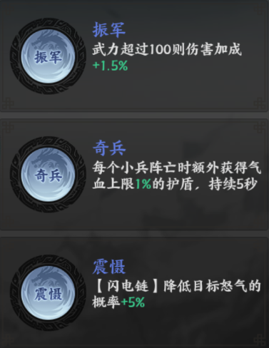 主提供气血加成与防御加成。突破至3星后拥有连击效果,相当于额外一次普攻,能更快叠加龙胆枪的增伤层数,并增加闪电链触发机会。突破至5星后为闪电链附加减怒效果,有效压制敌方怒气技能,30%概率每次弹射命中目标时单独判定,控场能力极强,频繁减怒让敌方较难释放技能。