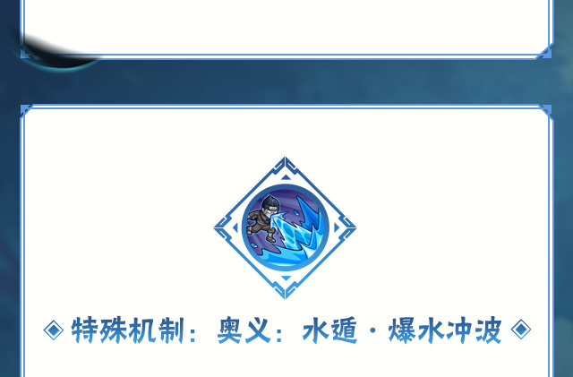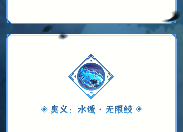 青年鬼鲛满奥义点时首次释放奥义会消耗两颗奥义点,吐出大量的水攻击敌人并覆盖决斗场,场景会变为水上战斗。青年鬼鲛在水上战斗时可打出水上普攻,技能表现也有所变化。