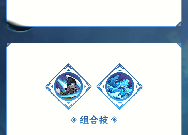 水上战斗时,一技能的鲨鱼命中后接二技能,青年鬼鲛同样会瞬身至敌人上方,随后下刺将敌人带入水底激起较大的水花,最后连同水面与敌人一同斩断。