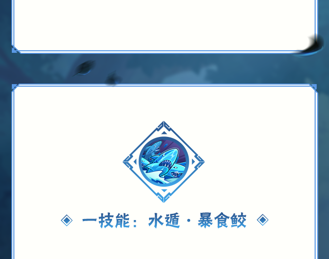 若进入水上战斗,短按一技能会释放群鲨攻击,长按一技能则召唤出两只鲨鱼在水中环绕形成漩涡,可持续吸附周围敌人,一段时间后朝中间发起夹击;若此时敌人身上还带有流血效果,鲨鱼会直接出现在敌人脚下追击哦!