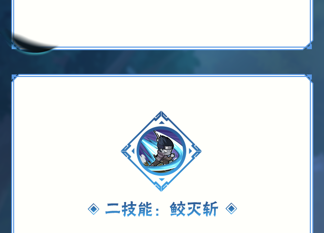 若释放一技能召唤群鲨命中敌人后接二技能,青年鬼鲛会瞬身至敌人上空,随后从天而降挥刀将敌人穿刺贯穿。