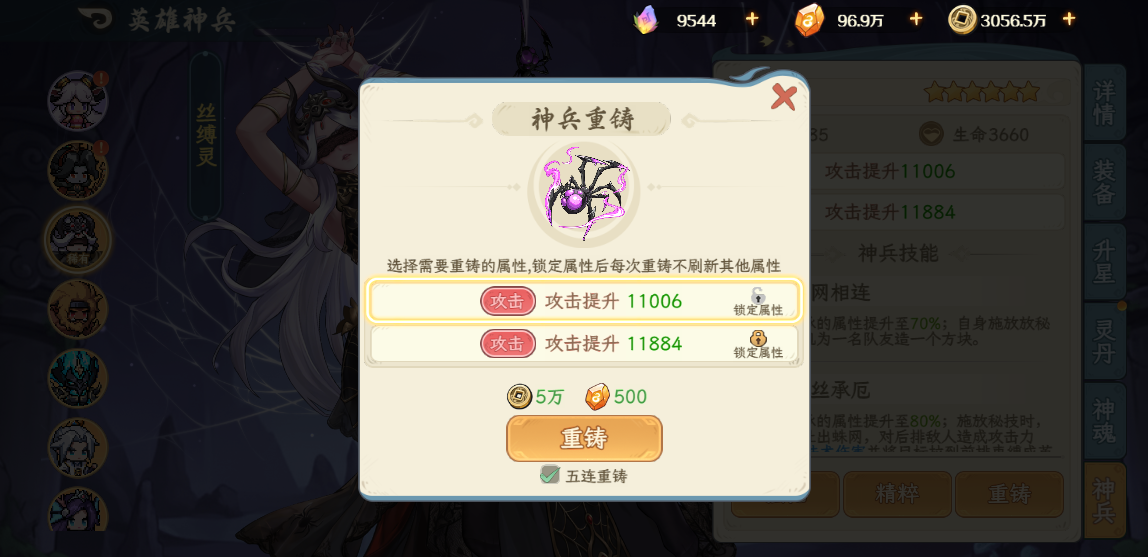 优化神兵重铸操作,增加【批量五连重铸】功能;