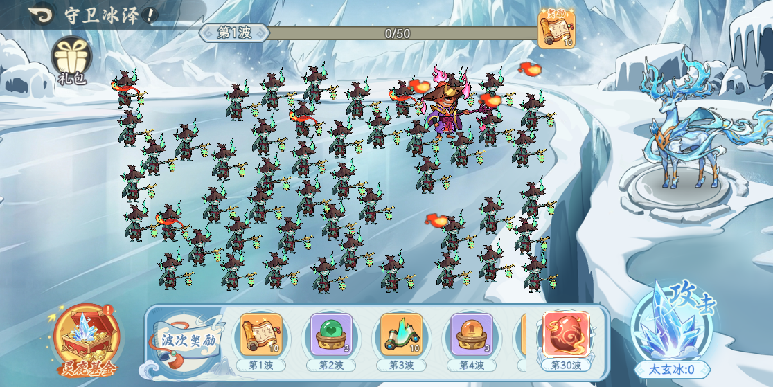 守卫冰泽:火鬼大军进攻冰泽,玩家操控灵鹿夫诸通过消耗道具【太玄冰】进行守卫反击,战胜的怪物波数越多,奖励越丰厚,神话灵兽蛋、自选神话圣物、自选河洛妖族至宝等你来拿;![]()