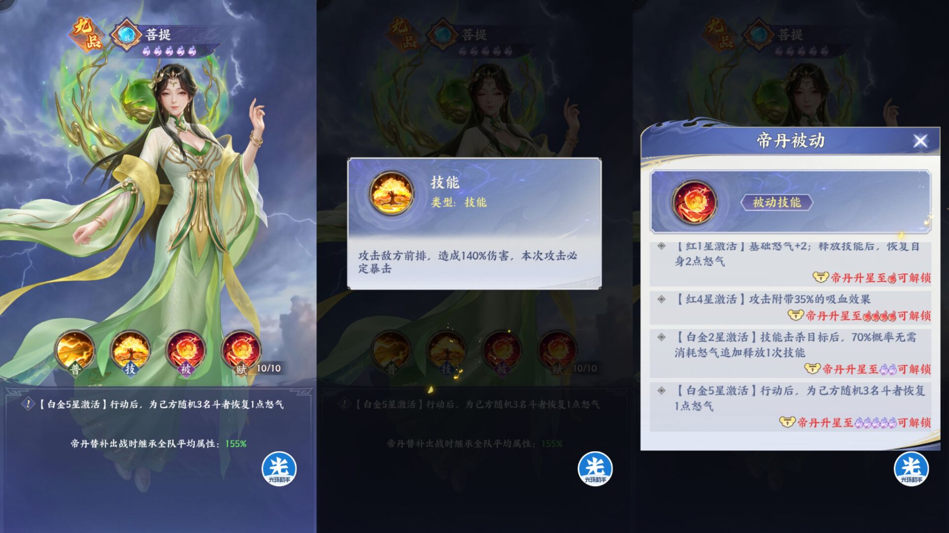 菩提的大招攻击必定暴击同时单体伤害爆发高白2星以后还有击杀追击机制,作为替换角色上场可以能够高效稳定的收割掉敌人。