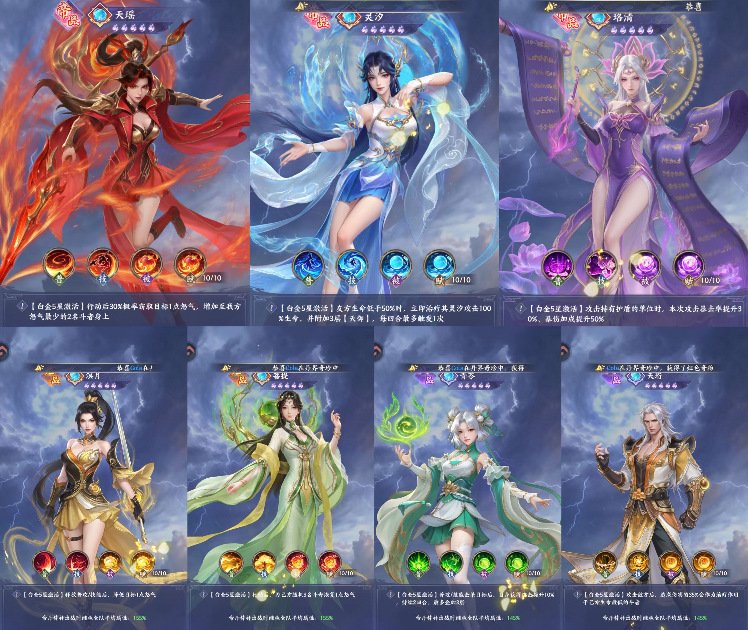 ①天瑶:自身免控+给敌人全体磨血+给全体增伤+偷怒,让我方珞清和天衍更好收割,从而加强队伍方队伍的战斗能力,削弱敌方的作战能力。