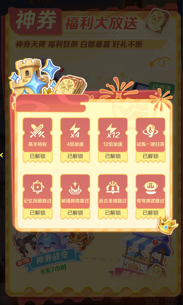 神券特权,助力回归!一次解锁八种特权,高手特权、加速特权、一键扫荡等,助力回归!