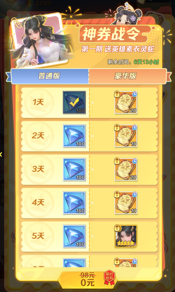 神券开团,低价横扫!▷ 买的人越多,折扣越划算!最高可0钻石购买含素衣灵蛇,神券在内的超多奖励!▷ 达成新折扣后,还会为已购玩家返还差价!