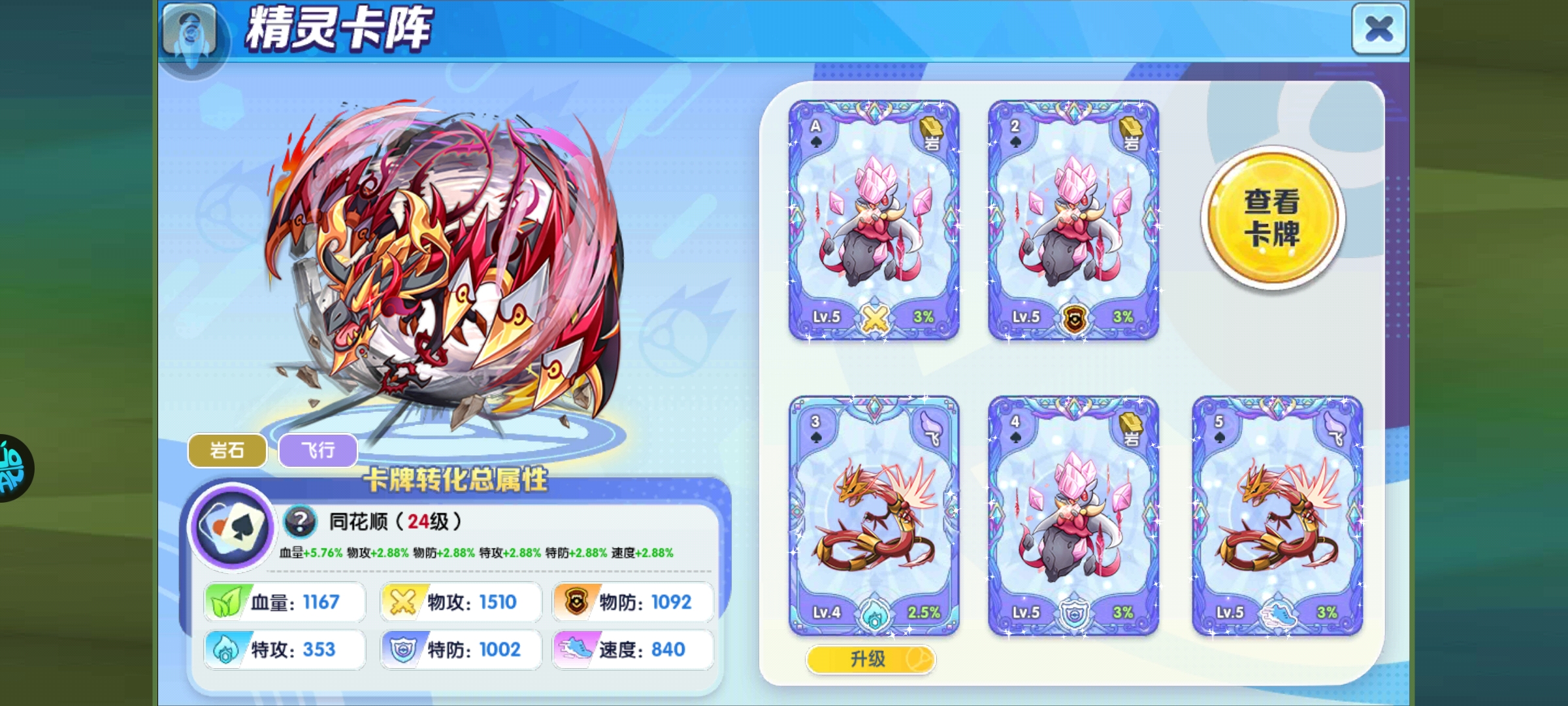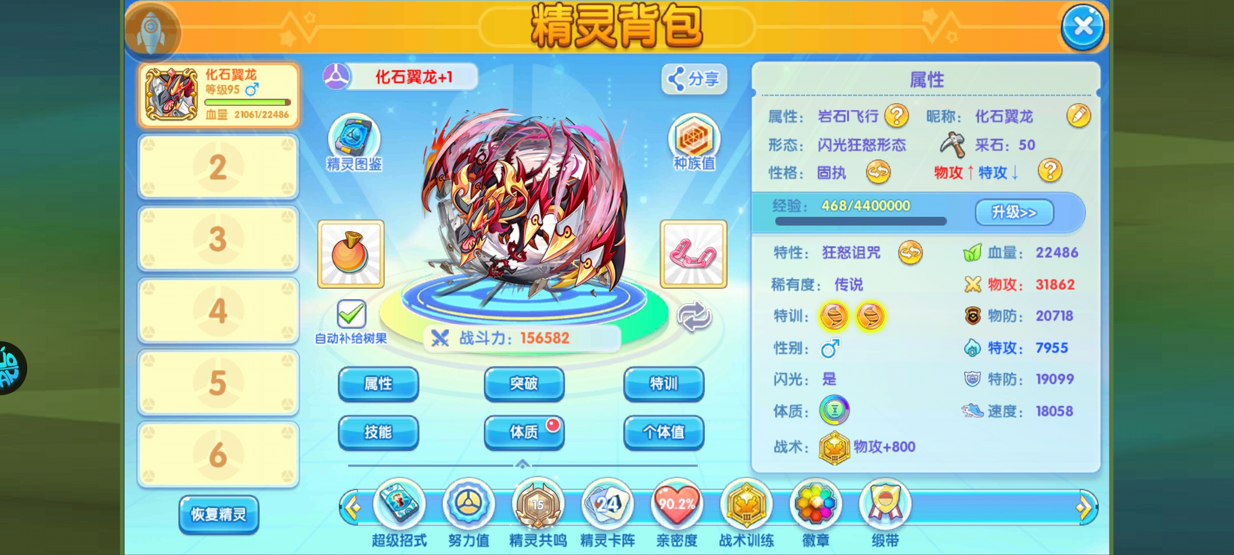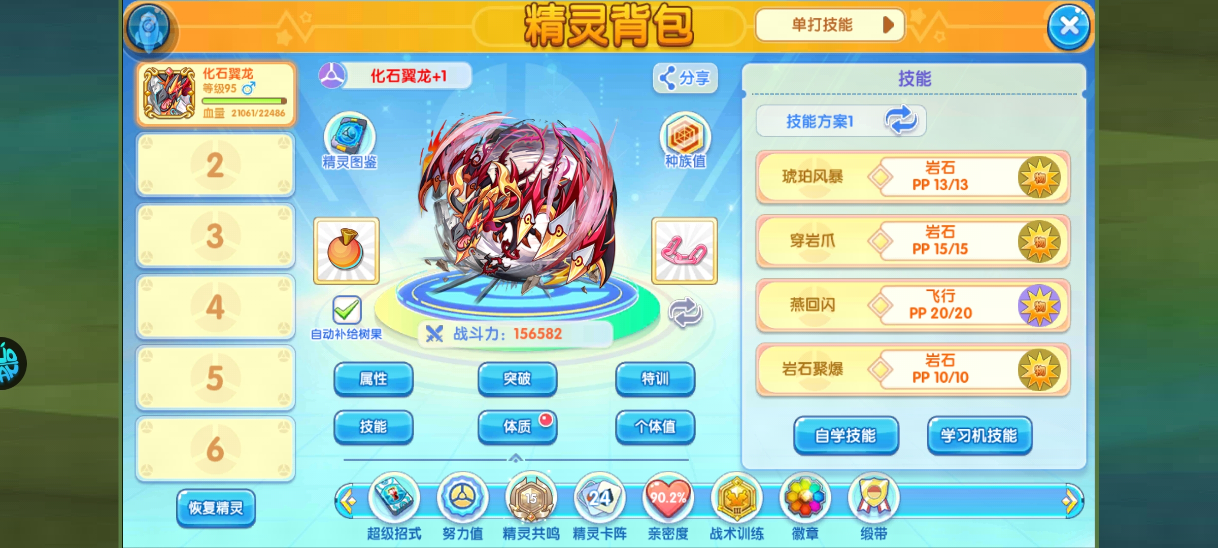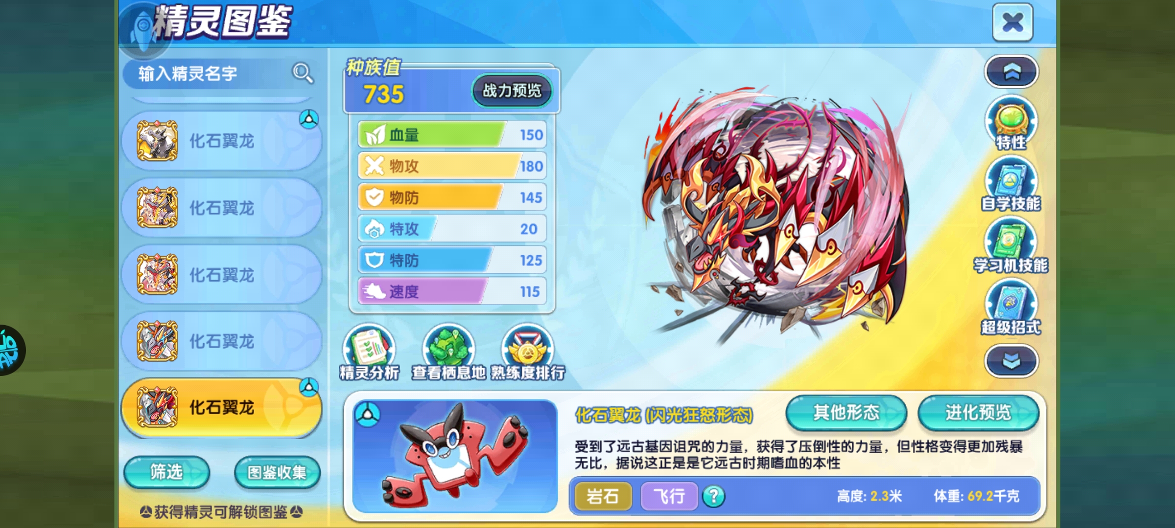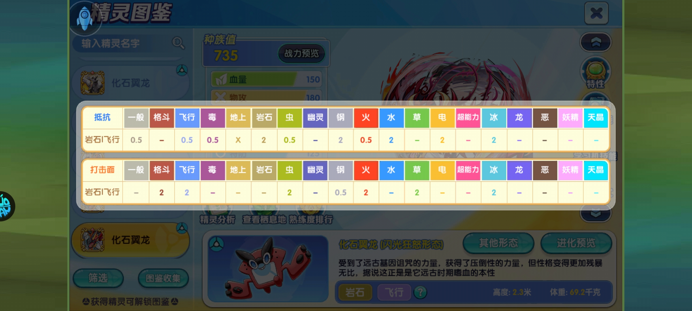 化石翼龙有闪光和普通两种,闪光的在之前的捕虫玩法白嫖过一次,这次加强后估计只能从688礼盒开了,这里我就直接用闪光形态做分析。化石翼龙的种族分配比较合理,这个价位宠物种族上总和基本都七百过左右,它的是735,无效种族只有20的特攻,有效种族加起来高达715,180的物攻符合输出手的标准,150的血量与145的物防配合特性更是肉的没边,虽然125的特防相对有点弱,但是特性给的扬沙天气下有1.5倍修正,面对特攻宠也是丝毫不怂,115的速度经过特性加成,同样可以达到第一梯队标准,因为自身特性给力,叠起来有很大概率先手,肉度厚还能自动回血,你打它也回血,克制打他还有减伤,180的物攻已经很高了,而且它还有特性强化伤害,配合特性的减伤,完全是个六边形战士。