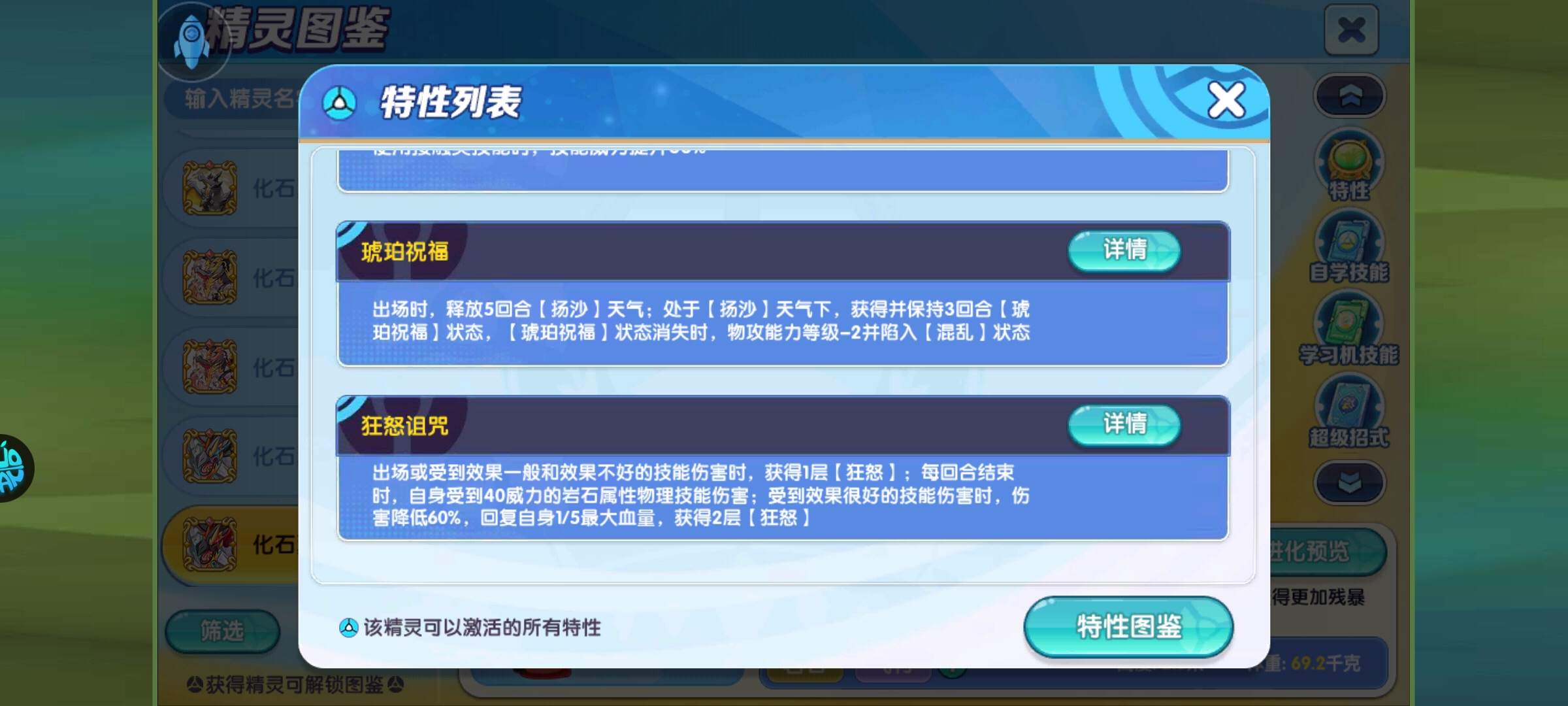 化石翼龙的特性有5个,最有用的就是新出的狂怒诅咒,首先是出场或受到效果一般和效果不好的技能伤害时,获得1层狂怒,注意是受到多段技能伤害时,只有第一段攻击会获得狂怒状态,所以不要想着找个多段一下叠满,而它的特性核心就是这个狂怒状态,然后是每回合结束时,自身受到40威力的岩石属性物理技能伤害,受到效果很好的技能伤害时,伤害降低60%,回复自身1/5最大血量,获得2层狂怒,很多人可能不理解,怎么自己还挨打呢,其实这是配合特性第一条让它自己可以叠狂怒,而叠的速度还很快,如果没这条,化石翼龙只能挨打叠的话可玩性就要缩水一半,但是自己叠只要找机会出场就好了,虽然被攻击但是有高额减伤和回血,反而回的更猛,基本两三回合就可以叠满。