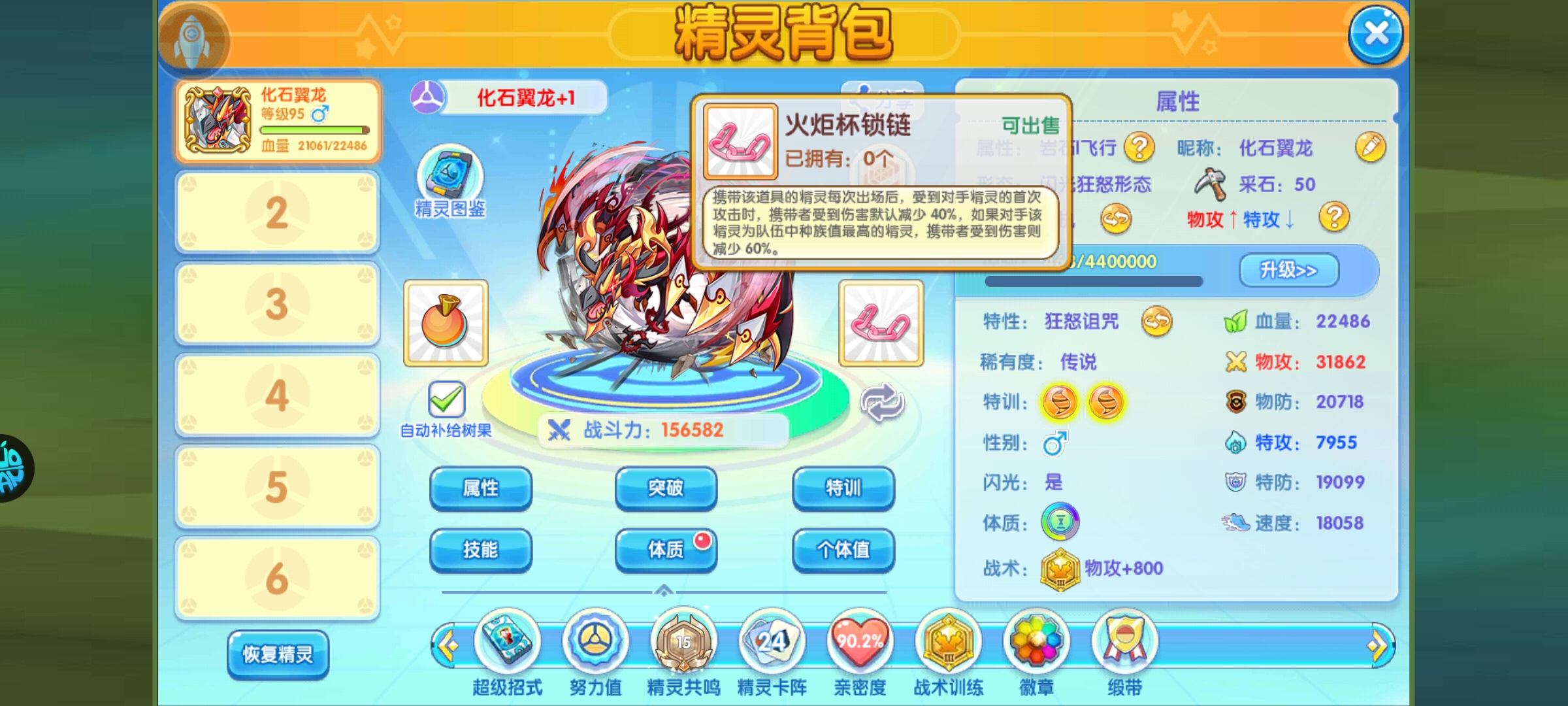 首先就是我带的是火炬杯锁链,这个可以让它抗伤效果更出众,能轻松吃下伤害后进行反击,对方换上新宠后也可以享受高额减伤。简单来说锁链就是可以切换、站场推队时候提升容错率。