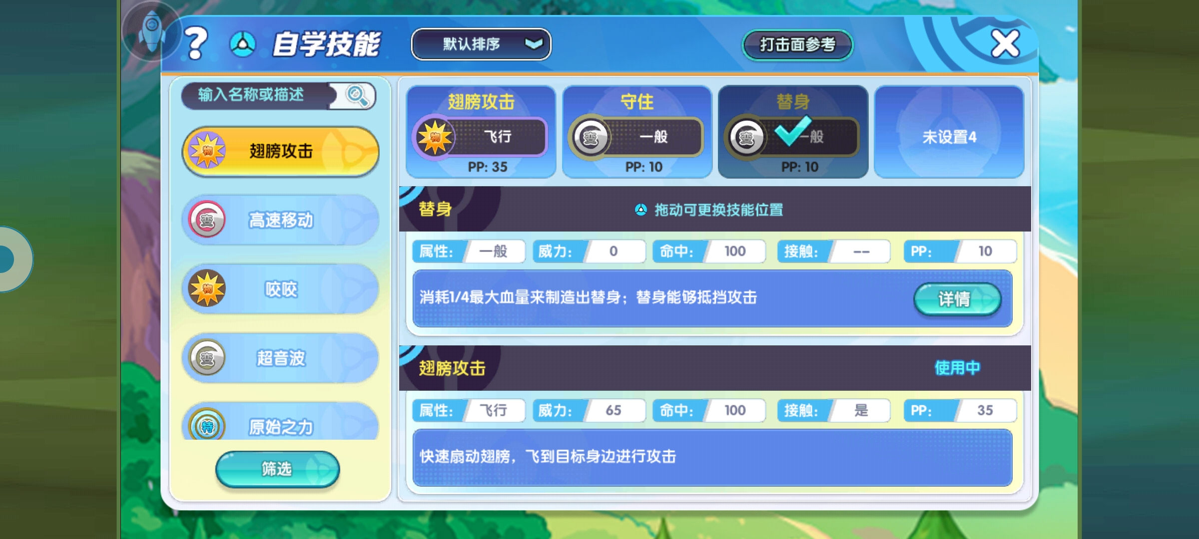 这个玩法核心就是守住和替身,它可学习技能非常多,这每一个它带了都不亏,所以我就都罗列出来了,用/符号给分开,可以选择性携带,但是打击面有限,毕竟守住和替身占了两个格子,如果对局是80级左右,守住也可以换成集沙,对方很少有宠可以一下秒它的,那么用集沙回血更多,天气下2/3回复量,配合特性自身的,对方攻击力度不够直接无解,只能看它叠起来,它如果防御叠起来,对方基本打不动了,输出叠起来对方又很难抗住它198%的加伤,速度叠起来,即便面对高速宠它又可以利用守住加替身叠其他项,而且面对内战更占优势,输出里面更多的技能我就不说了,前面介绍过程中提到了每个技能的特点和应用场景,这里再说下岩石聚爆,这个其实也可以带,虽然威力不显,但是替身后抓住辅助赖回合,很容易叠到自己想要的buff,也是一种套路,出场时候如果有合适机会,叠狂怒和叠buff凭借岩石聚爆还可以二者同时进行,个人建议,这种必须还是要携带一个高输出技能,要么琥珀要么飞追,不然叠起来对对方没有威胁力。