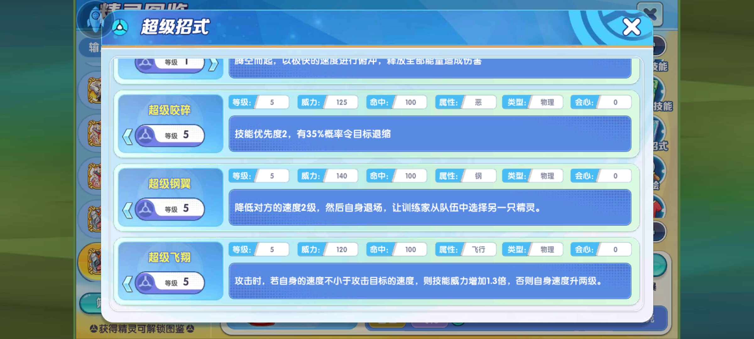 它没特别出彩的大招,这里只能推荐超级咬碎,技能优先度2,有35%概率令目标退缩,一方面让它可以稳定触发先手,即便对方带同样优先度先制也不怕,然后不带恶系技能用它也可以补充打击面,针对异兽王,另外一方面就是赌对方定住白白控制一回合,更有利于它叠状态。