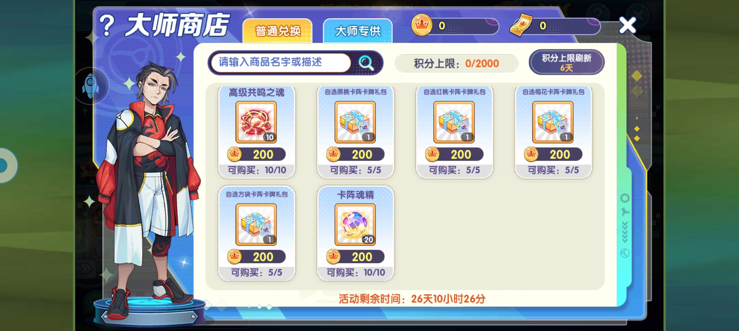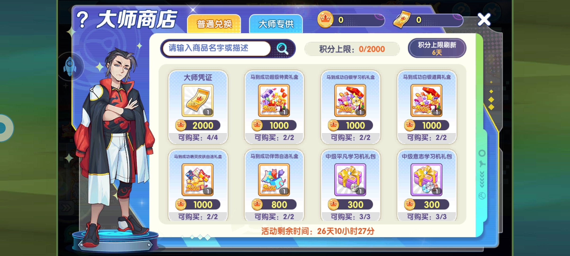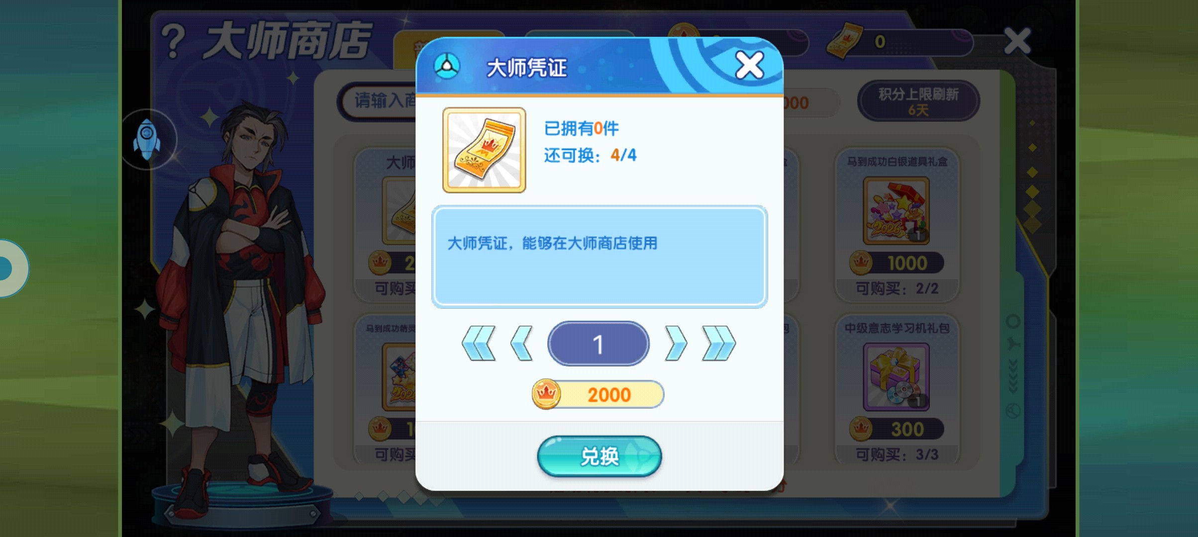 有了这张券就可以去大师专供里面进行兑换,一整期大师商店拥有四次刷新时间,一周刷新一次,一次可以兑换一张,那么一共可以兑换四张,所以如果不想要其他道具和资源的话,那就把这个积分留着用来兑换这个凭证,每一周获得的积分上限是2000刚好换一张卷