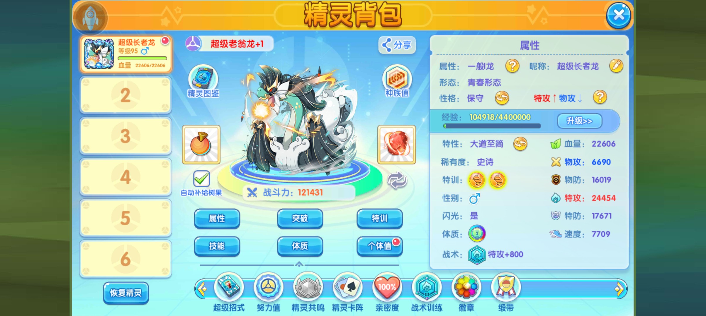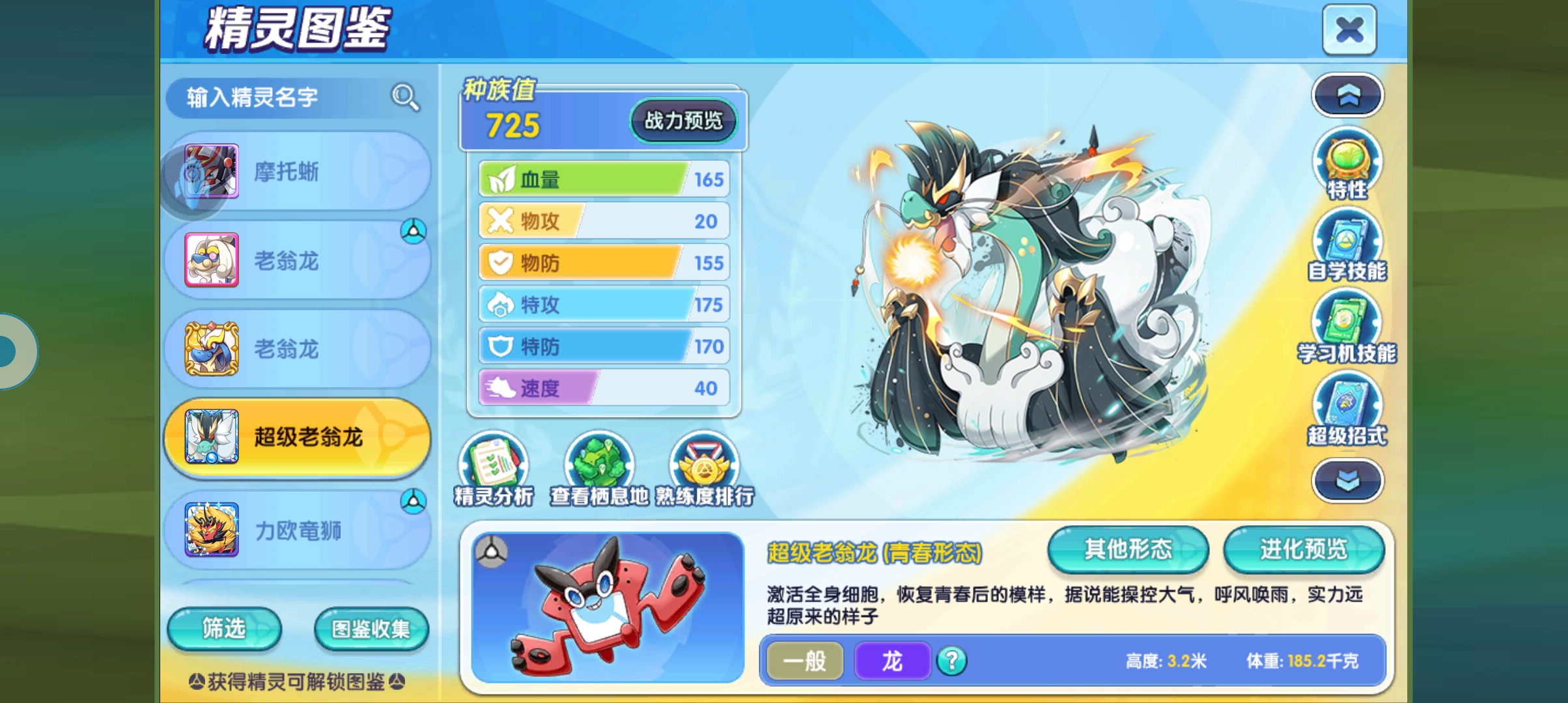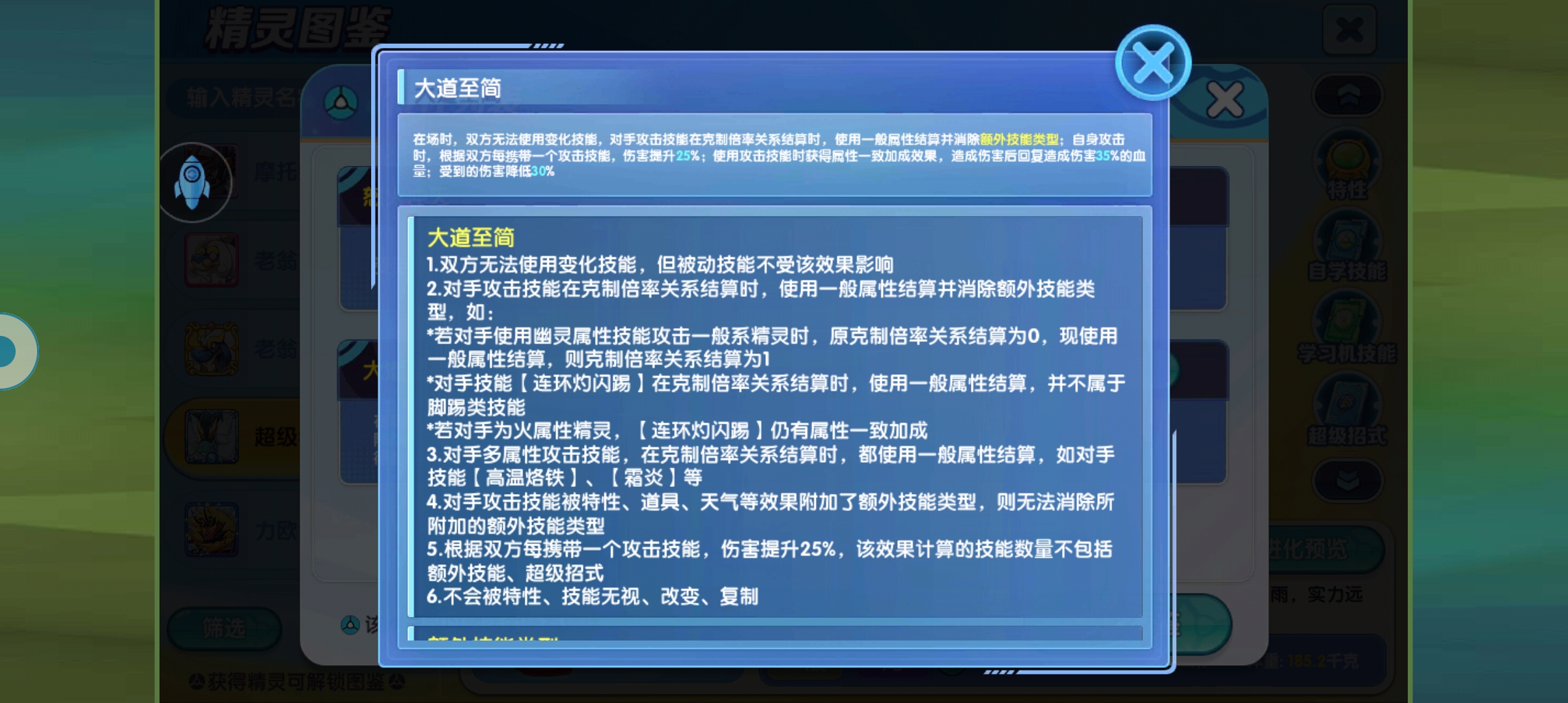 自身的特性的话,就是一个死斗加强版的效果,就是双方没有办法使用任何的变化招式,如果使用就会失败,然后根据双方携带的攻击招式进行加伤,每携带一个就可以增加25%的伤害,那么这个精灵带来四个攻击招式,自己就加了100%的伤害,也就是说,自身的每一个招式都是翻倍的效果,这里还有有一个效果,那就是对方进行伤害计算时,按照一般属性进行伤害计算,但对方的这个技能仍然享有属性一致加成效果,具体的大家可以看上方的视频,剩下的就是常规的减伤和吸血,这个吸血的话是只有35%的,不过只要能打出高额的伤害,吸的血量还是蛮多的,而且自身也不怕对方的克制伤害,所以坦度大家也不用担心。