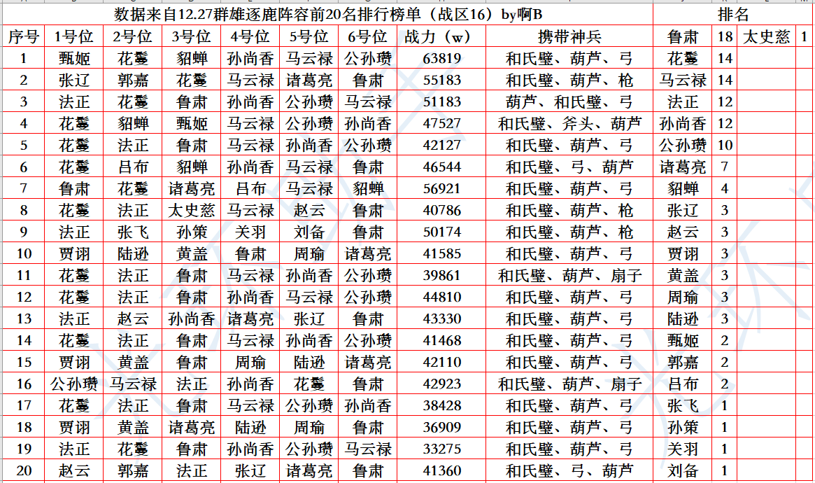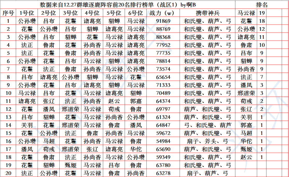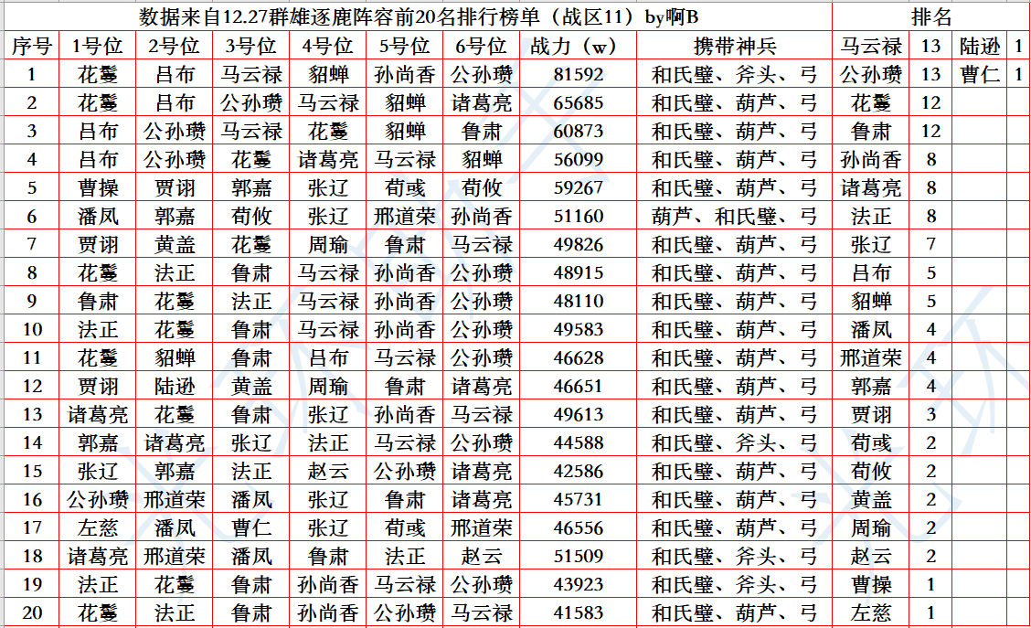上周的趋势已经逐渐放弃了花吕布,换成了人权组合,花马+鲁肃+诸葛+法正+公孙瓒,把版本强势的武将融合在一起,等后面新武将陆续上线,不难想象稀有武将的时代已经快要到来了。