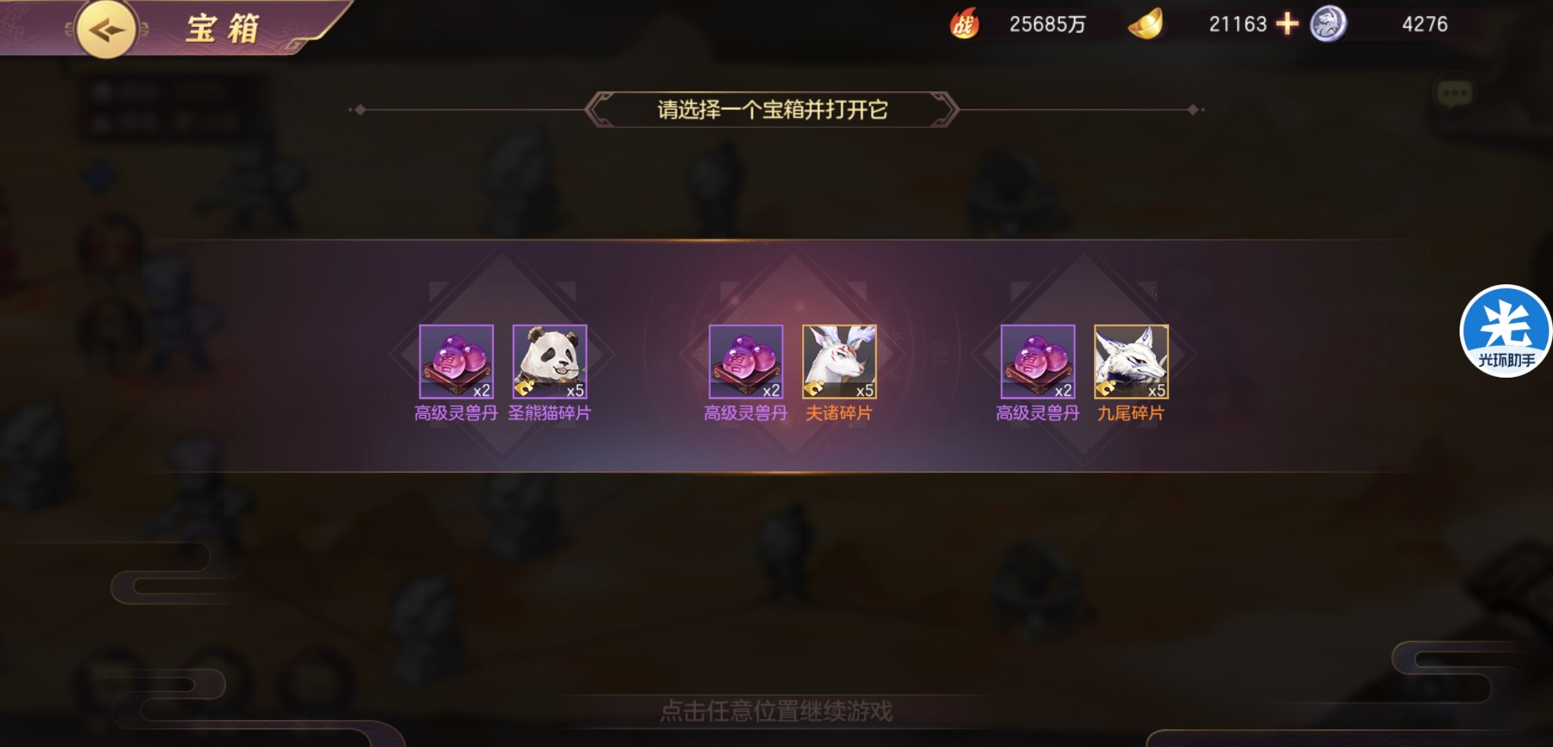 再者就是元宝箱子的购买,元宝富裕一点的可以全开,现在灵宠系统养成初期,不管是什么品质碎片都是需要的,不要吝啬元宝。
