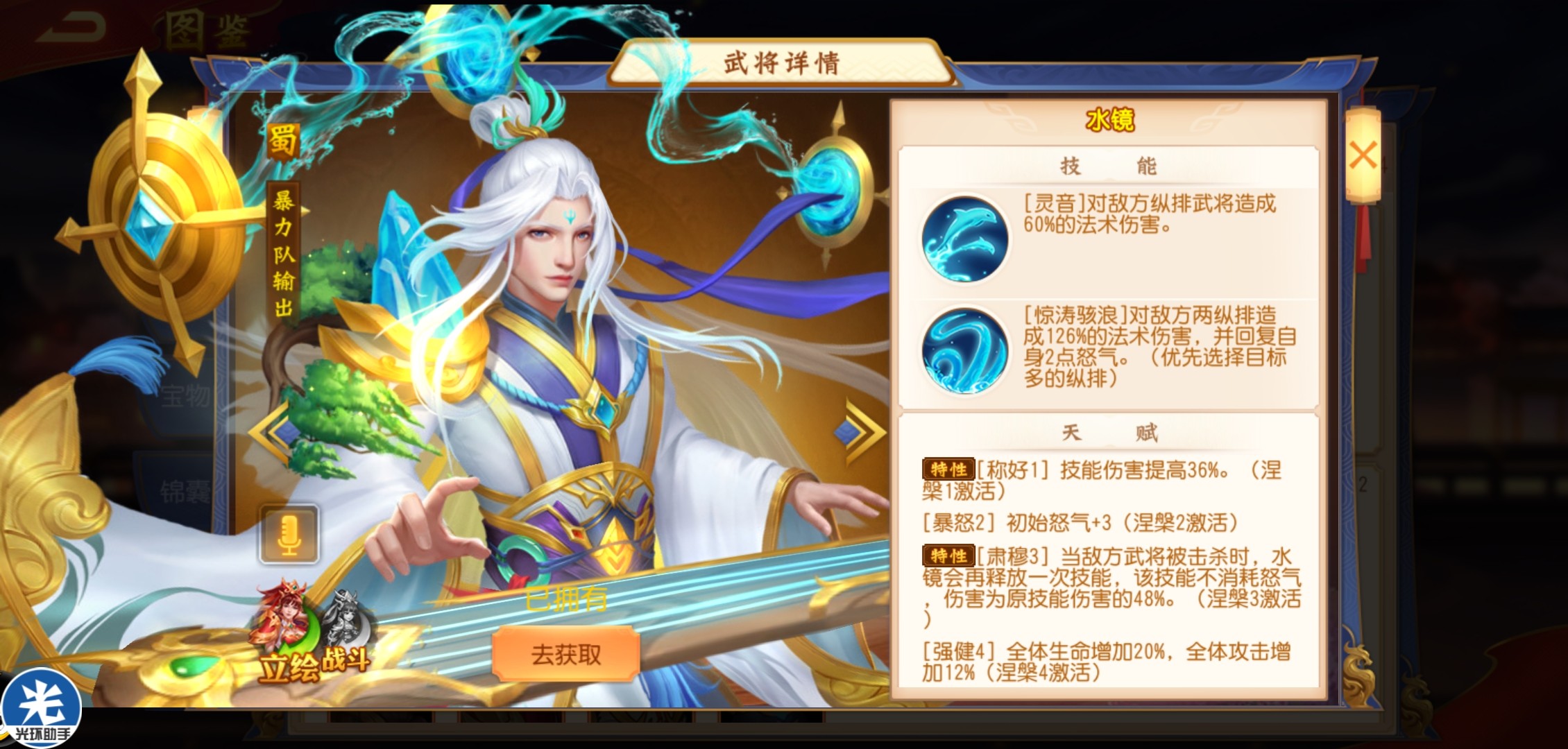 蜀国的发展会更漫长得多,而金将水镜在游戏的前期会有很好的表现,随着后期防御能力的提升,水镜的输出会慢慢降低,能有一个红将赵云辅助输出是最好的。