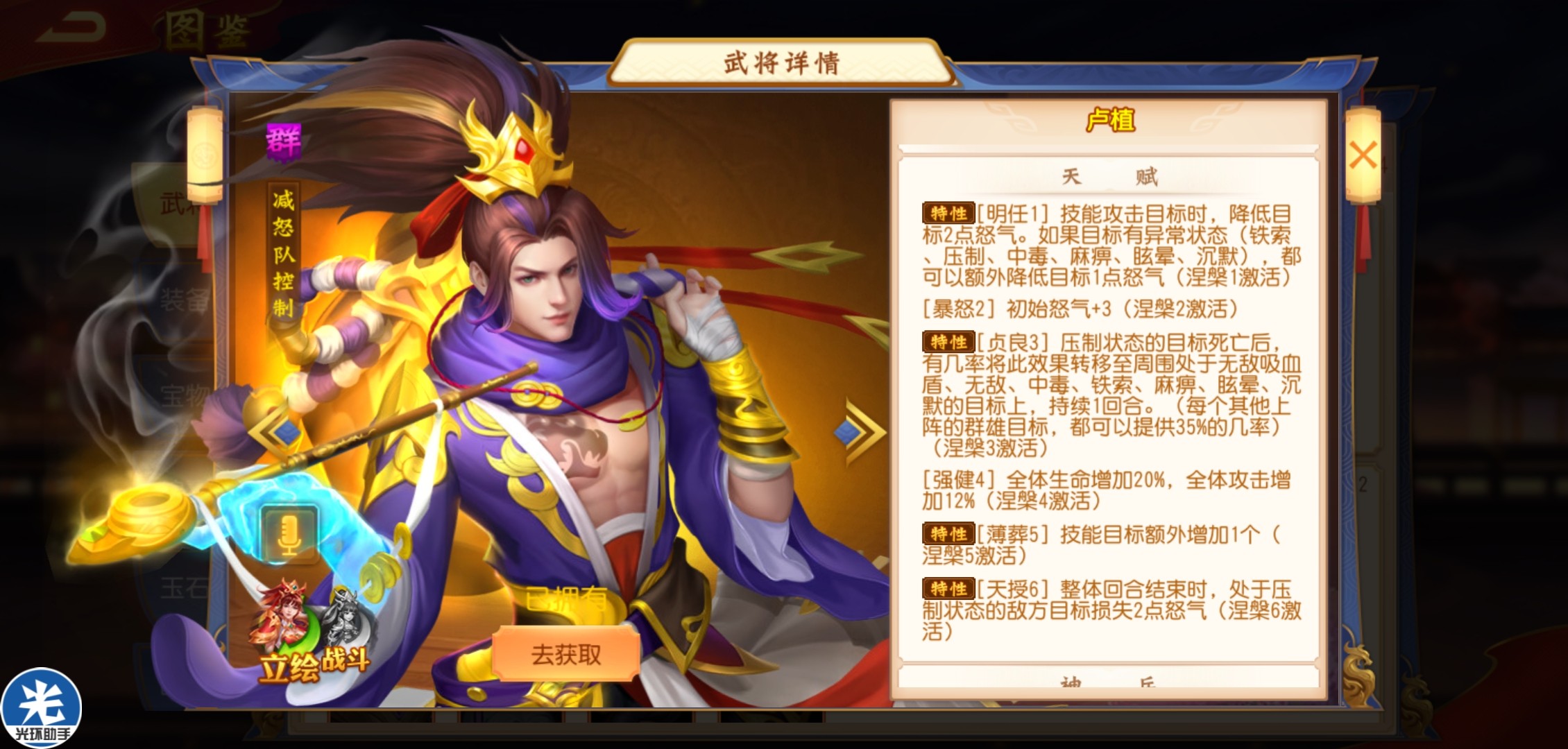 在发展的过程中,卢植可以涅槃3就上阵,更多的金将资源可以激活名将册,开启金色战法气定神闲,七窍玲珑等。