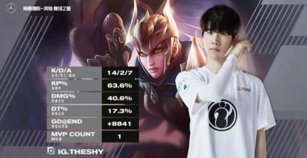 在第二局比赛中,IG战队更是拿出了“五脆阵容”,而Theshy也选择了上单奎因,在比赛中,Theshy使用奎因打出了14杀的战绩,并直接Carry了全场,而且Theshy还打出了对位经济8800的差距,这也让IG战队直接以2-0击败了RW战队,取得了比赛的胜利。
