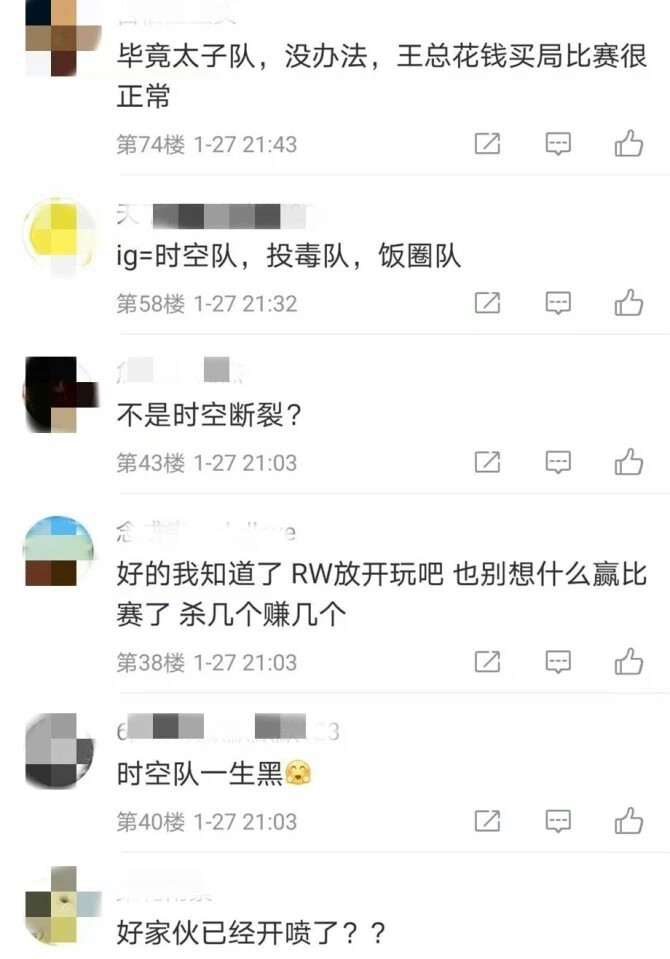 然而在第二局比赛中,由于Rookie选手的设备问题,IG战队与RW战队的比赛也是进行了“时空回溯”,然而就是这次的时空回溯也让IG战队被喷了,很多的粉丝们都留言吐槽IG战队的时空回溯,这也让IG战队赢了比赛,却遭到了粉丝们的留言爆破,而LPL解说米勒更是发文“坏了”。