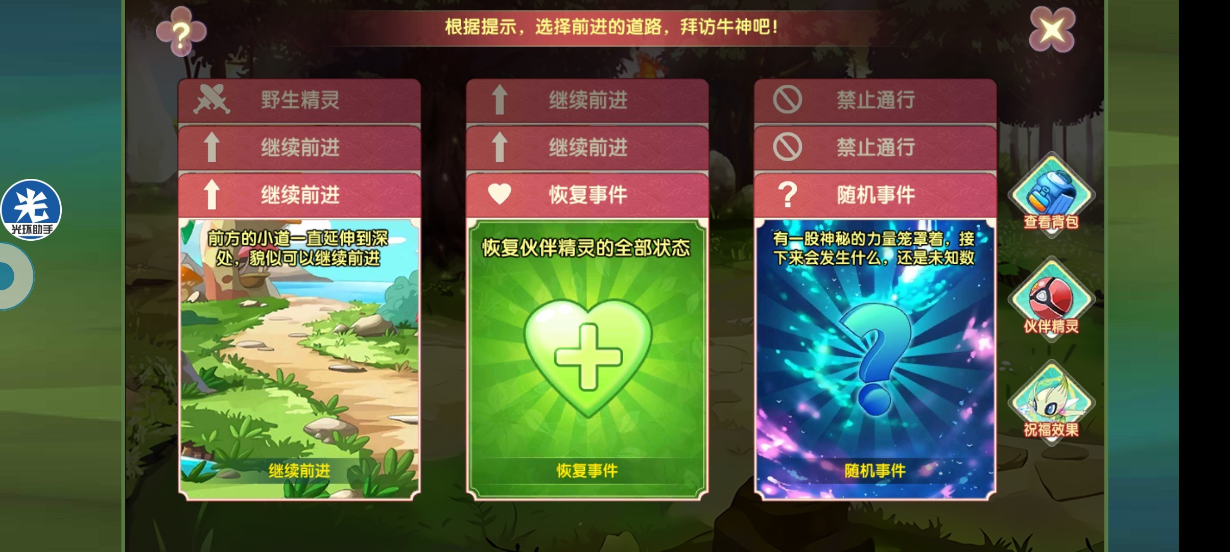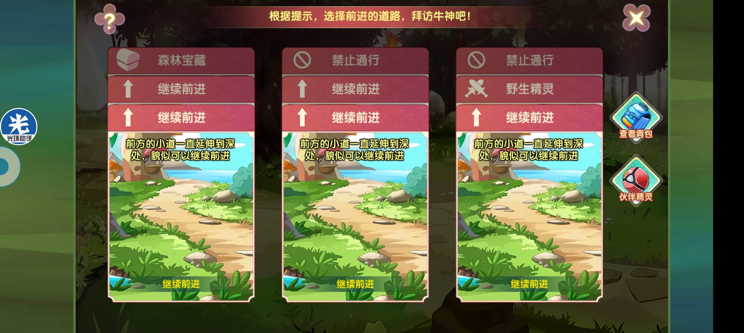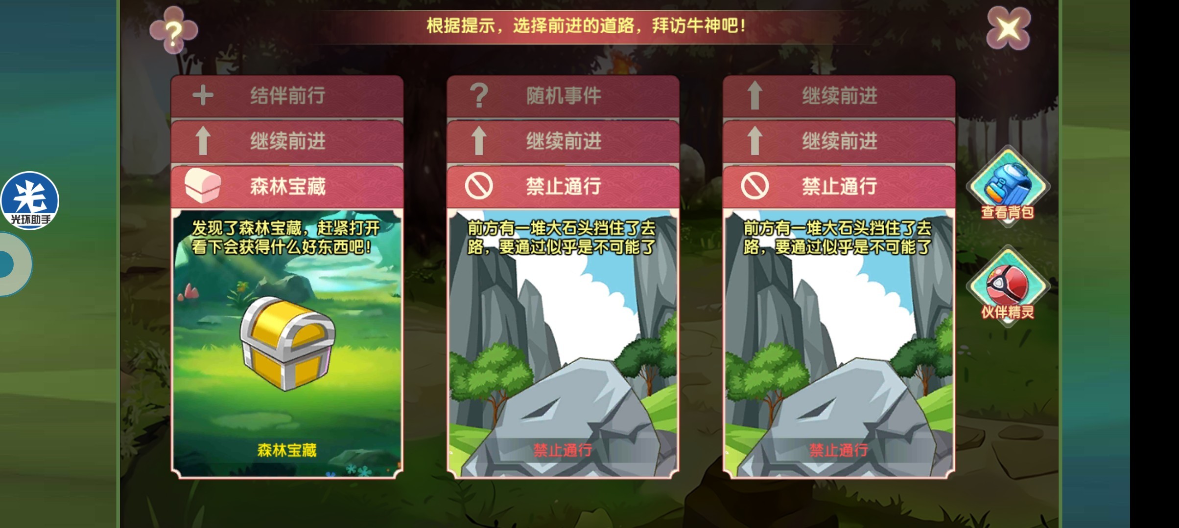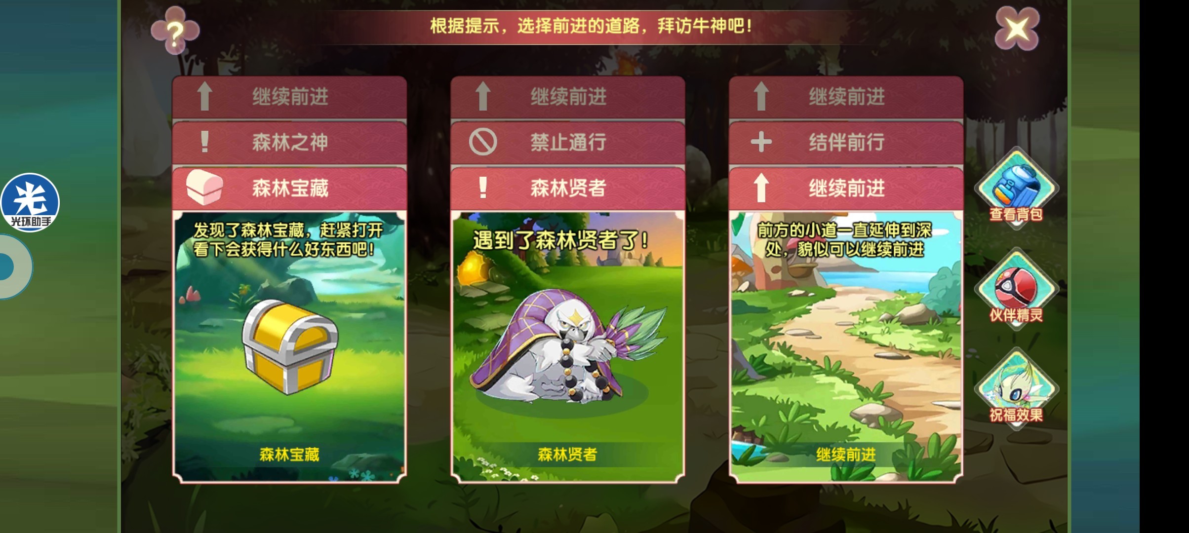 这上面有一个提醒,大家都看到了,比如说最左侧的是一个森林宝藏,森林宝藏上是一个继续前进,在往上就是结伴同行,结伴同行,可以让我们获取新的宠物,所以玩家一定要观察这三条道路上方的题型是很关键的