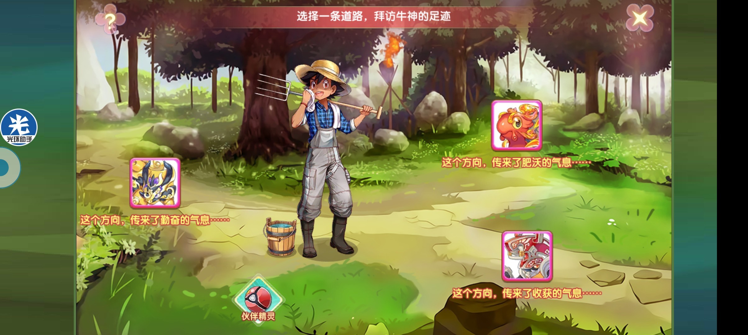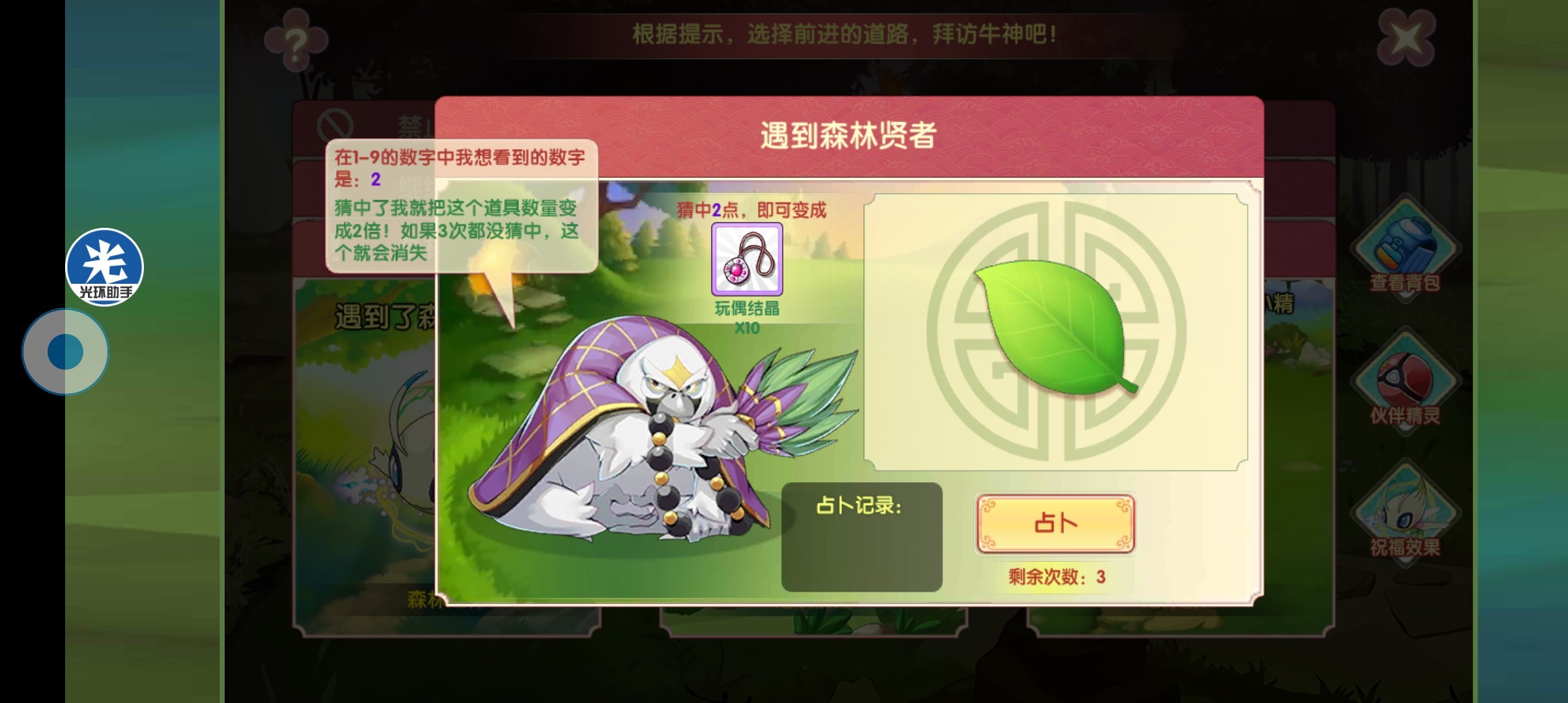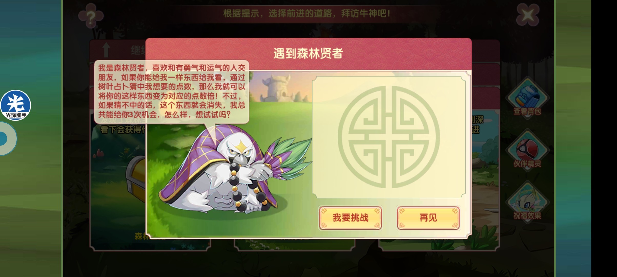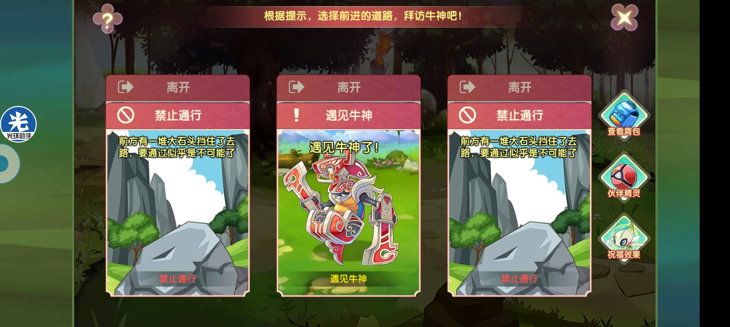这上面有一个提醒,大家都看到了,比如说最左侧的是一个森林宝藏,森林宝藏上是一个继续前进,在往上就是结伴同行,结伴同行,可以让我们获取新的宠物,所以玩家一定要观察这三条道路上方的题型是很关键的