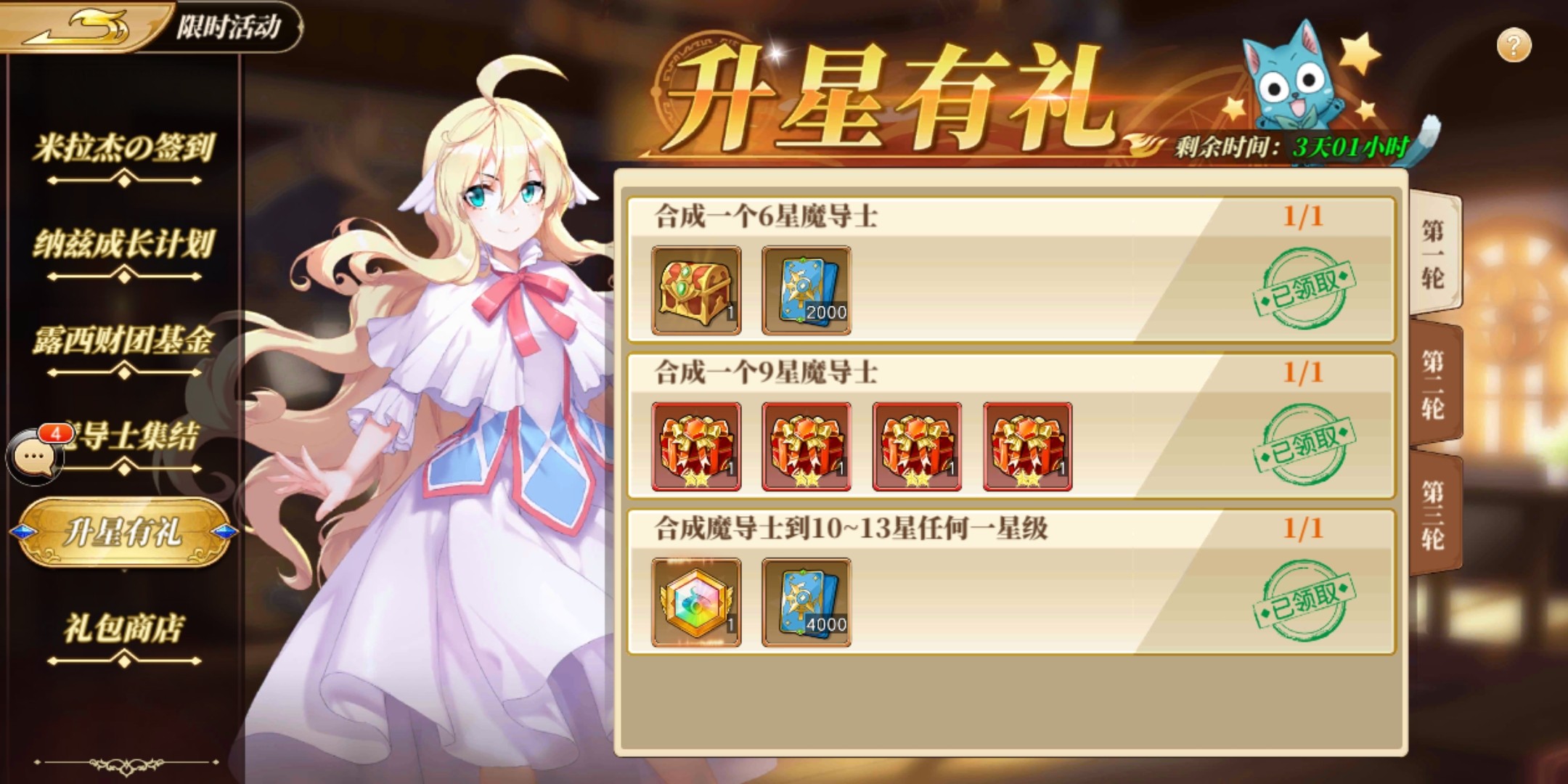 这个活动对于低V玩家比较友好,因为升星慢,所以奖励能拿满,氪金玩家就有点尴尬了,升星快的话,三轮不够升,等下个月又需要很长时间,难受。