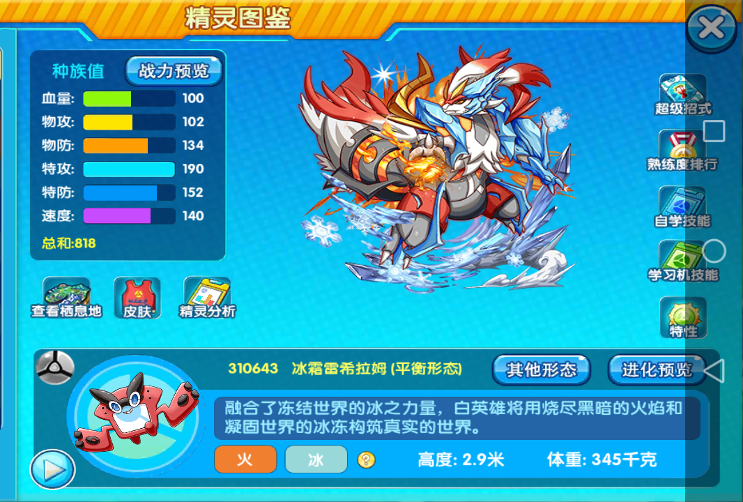 雷希拉姆也叫做白龙是和黑龙捷克罗姆相对的一个精灵,主要是走辅助路线,和黑龙一样,也是合体之后才能够发挥能力的一个精灵,如果没有进行合体的话,他的实力不会得到提升,属于一个比较平庸的精灵,不太推荐玩高级狩猎券保底数量:55到60