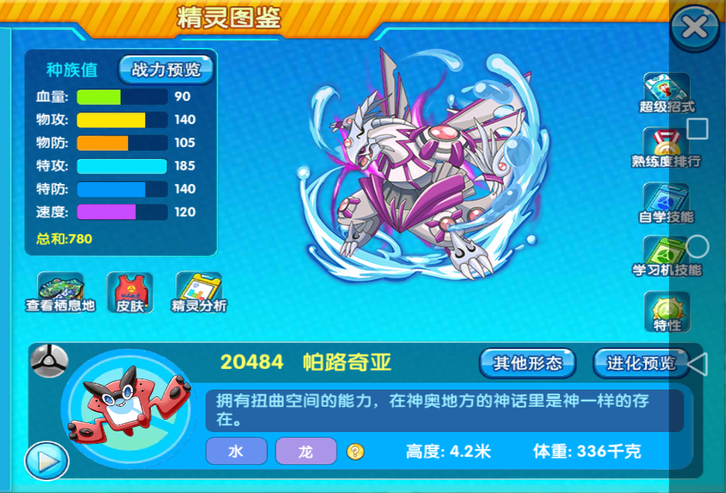 帕鲁奇亚也是早期的超进化精灵之一,是一个属于暴击流的精灵,隔空切断配合对焦镜片可以拥有50%的暴击概率也可以使用紧张感猛毒素和电磁波这种打法,可以说是风靡一时。