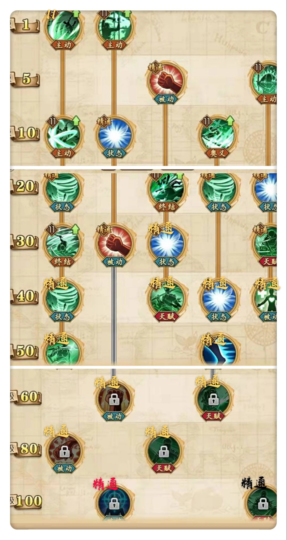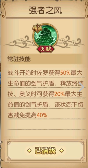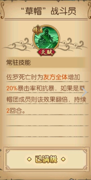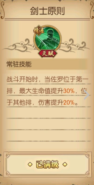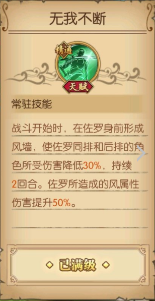 50级天赋【无我不断】:索隆同排以及后排受到伤害减少30%,风属性加成50%。
