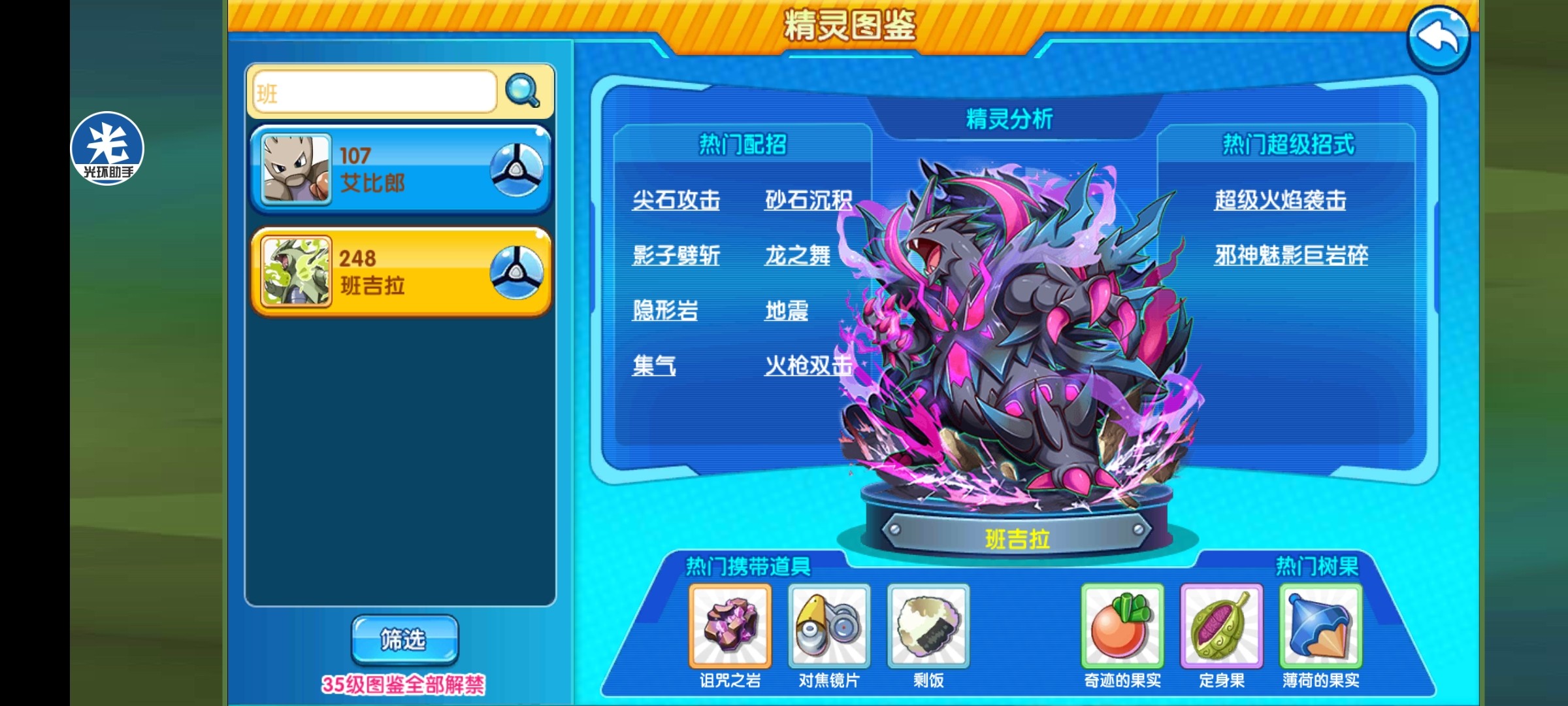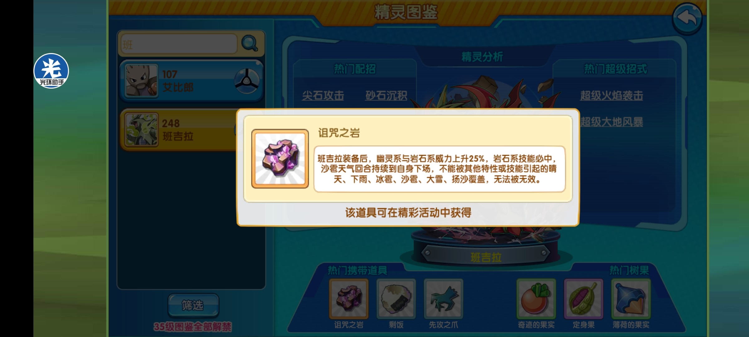前言:大家好,以前随着电冰洛托姆为主力的雪天队的异军突起,很多玩家饱受其毒害!很多人想办法去对抗电冰洛托姆,而我也是因此接触到它,虽然现在不强势了,但是也有不错的可玩性,它就是荒漠*重岩形态班吉拉。