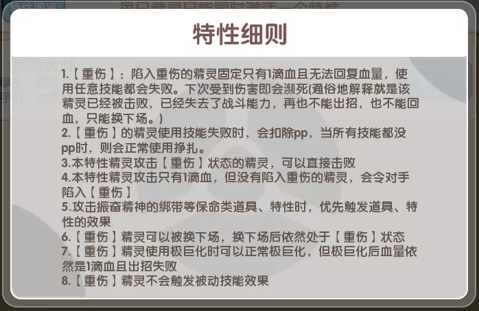 拳脚大师:持有该特性的精灵,拳击、脚踢类技能伤害提升40%;当自身使用任意技能击败对手时,对手会剩下1滴血量并陷入【重伤】状态。