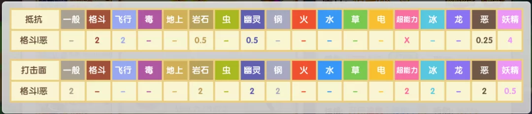打击面:格斗+恶的打击面比较稳健,避开妖精系的话都能有相当不错的输出表现。精灵特点