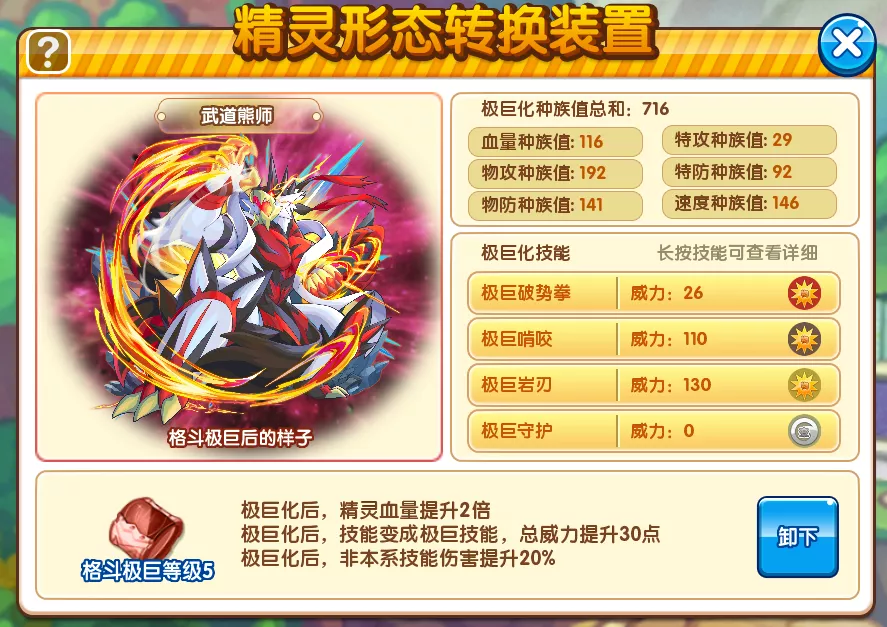 可以进行格斗极巨化,格斗极巨5级效果:精灵血量提升2倍,技能变成极巨技能,总威力提升30点,非本系技能伤害提升20%。