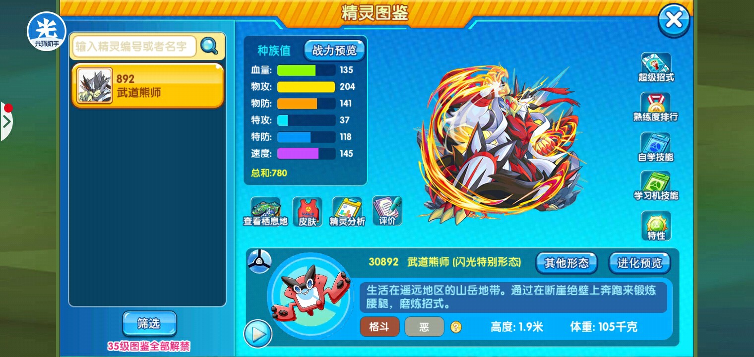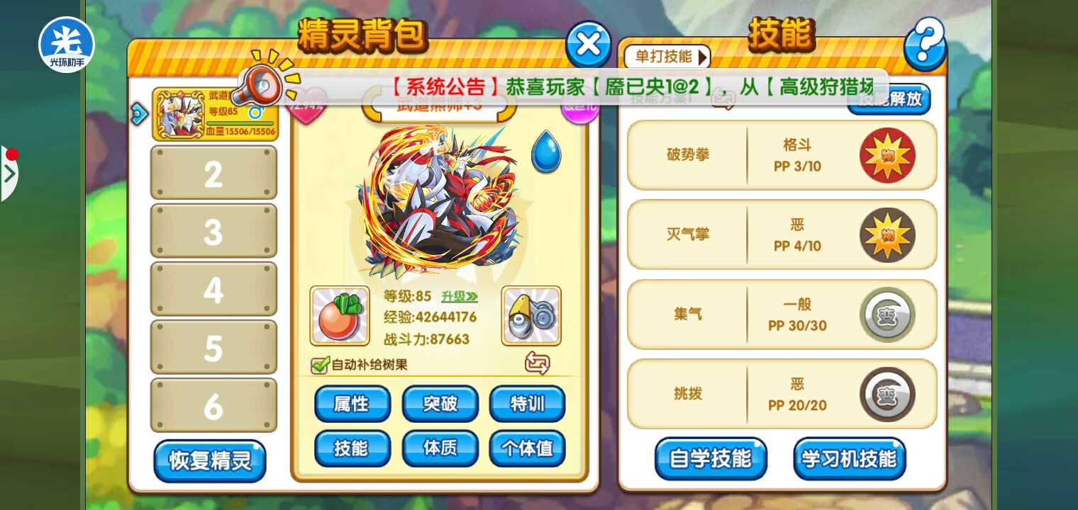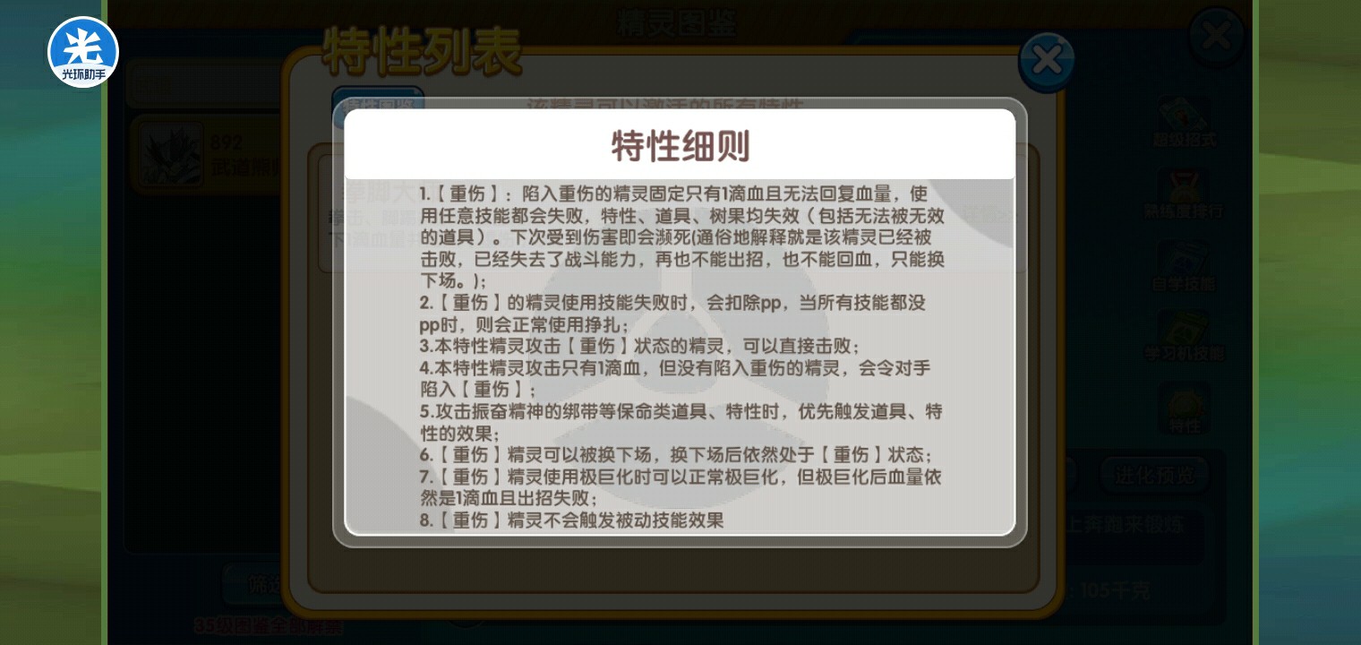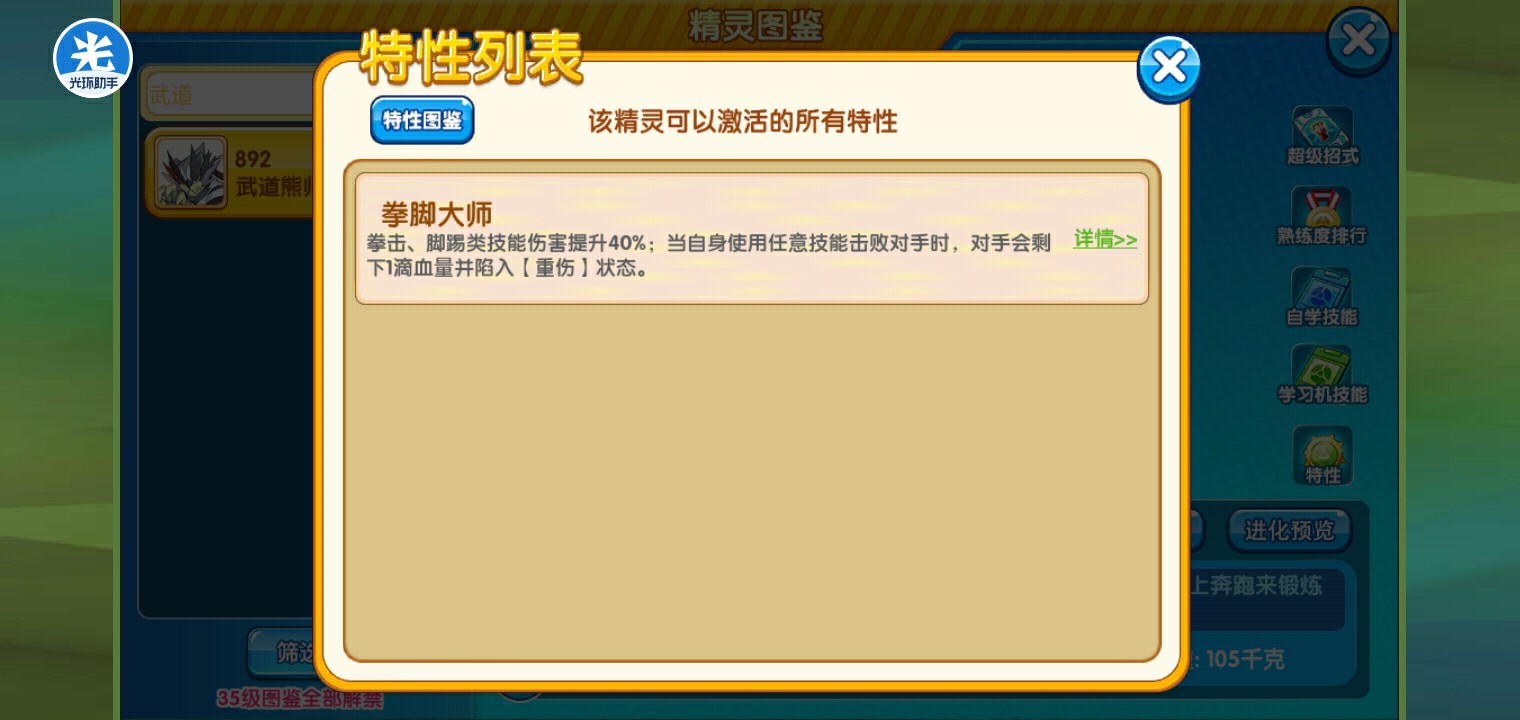 精灵核心所在;拳击类、脚踢类技能伤害提升40%,但我不推荐各位为了伤害提升40%而全部带拳击类、脚踢类技能,这样会限制自己技能携带。“当自身使用任意技能击败对方时,对方会陷入1滴血并陷入【重伤】状态。”技能中也有详细介绍,我这里简单讲俩句:当我用灭气掌打黑马(打死)常理来说对方第一条命会阵亡触发第二条命,但武道熊师不一样你会陷入【重伤】处于一种“似死非死”状态,什么都做不了,要么换精灵要么被打死。这个特性非常克制俩条命精灵(黑白马、凤王等)