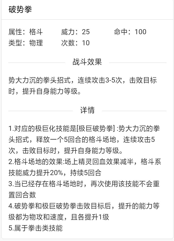 理由:主要输出手段,极巨化状态使用破势拳可以触发格斗场地,在场地加持下格斗系技能威力提升20%+特性40%恐怖如斯。破势拳优点其一击败对方精灵后还有物攻+1和速度+1的属性提升。其二相比于其他技能例如爆裂拳,破势拳优点就体现出来了,命中率100%输出稳定打死还有属性增加。这个版本弱格斗的精灵也很多(巨金怪)。属性提升和打击面。