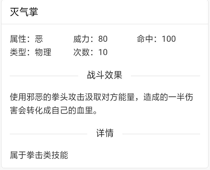 理由:作为一位输出手,如果不选择“自sha式”打法那必然要带一个续航技能,(自sha式类似于钢铝龙这种不带回复,选择速战速决/以一个精灵换对面多个精灵)那灭气掌就是最优解,与吸收拳对比,首先破势拳和吸收拳在属性上就重复了;其二灭气掌属于恶属性技能可以打黑白马,(有些白马喜欢带装甲,在对战时注意使用技能伤害的变化幅度)打击面非常广(骡子马/合体月/百变海皇/月神等)