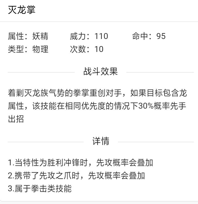 4)灭龙掌:在这个龙属性时代不来一手灭龙掌反制?还可以打胡帕。有先制概率,前提对方是龙属性精灵,可以吃到特性加成。