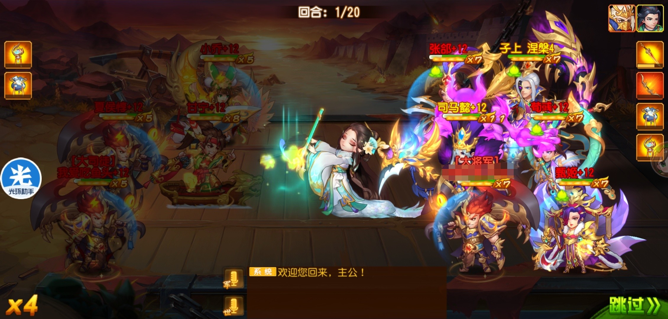 这个阵容也有一些极限输出,多辅助武将的味道。因为资源不够,只能上阵辅助武将加强属性加成。