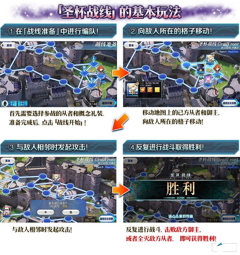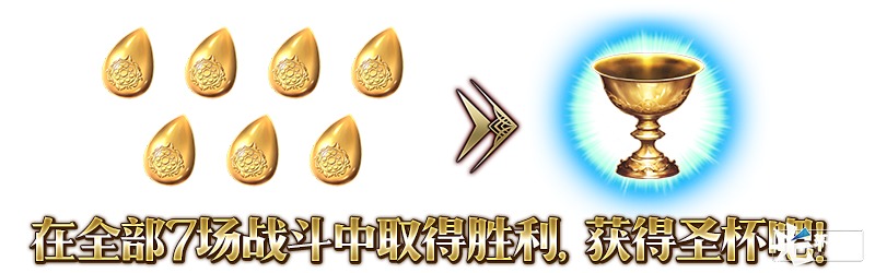 在本活动中,「圣杯战线」将逐日开放。在圣杯战线中,敌我双方的御主和从者将在专用的战斗地图上通过反复战斗争夺胜利。取得胜利后可获得1个圣杯之滴,收集7个圣杯之滴即可兑换圣杯。争取在所有战斗中取胜,获得圣杯吧!