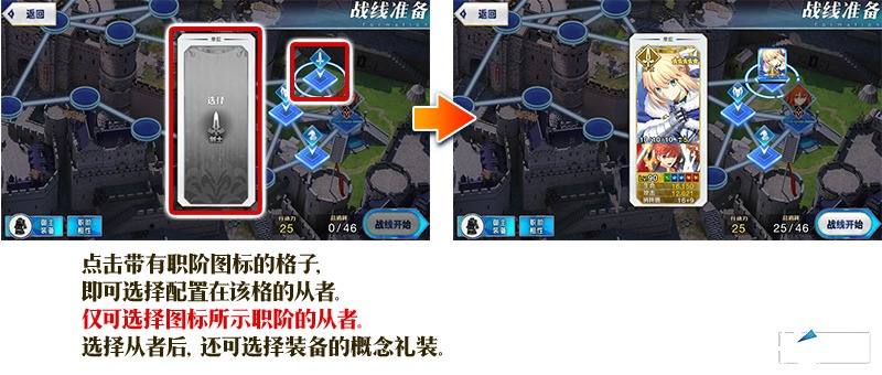 在圣杯战线中,首先需要在「战线准备界面」选择御主装备的魔术礼装和出战的从者。