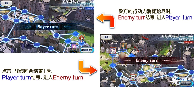 在圣杯战线中,己方在地图上行动的Player turn和敌方行动的Enemy turn交替进行。