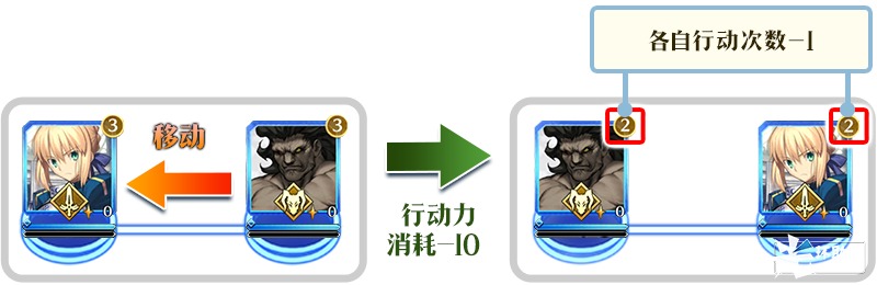 进行替换的2骑从者视为移动,消耗10点行动力,各自的行动次数-1。