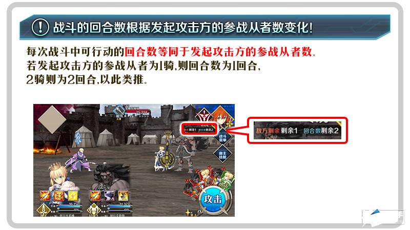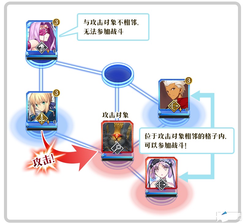 在上图所示的情况下,位于被攻击者相邻格子内的1骑己方从者和1骑敌方从者也会参与战斗,战斗将以2对2的形式开始。