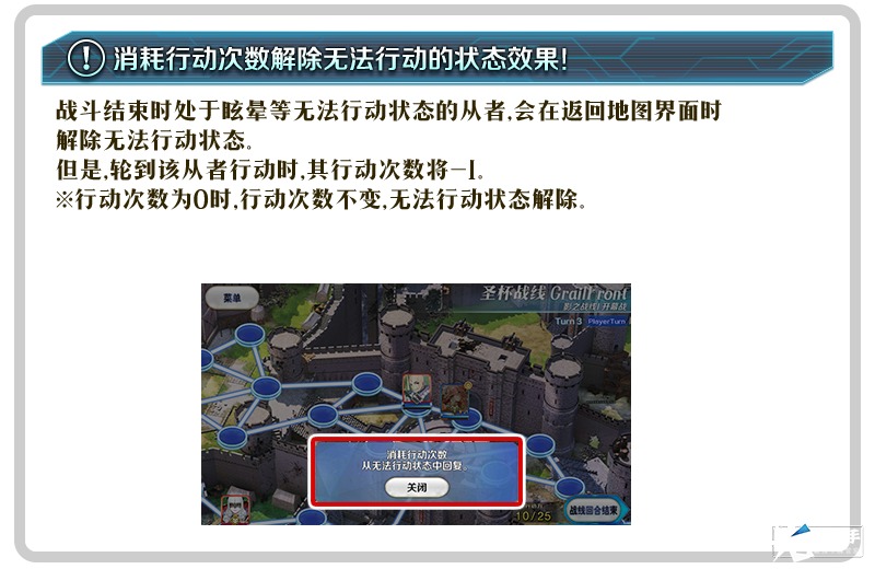 此外,在战斗结束后,技能的冷却回合数、技能或概念礼装付与的状态效果的持续回合数、效果回合数会在同一张地图内被继承,直到下次战斗时才会继续计算。