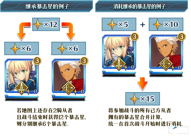 此外,若有多个拥有暴击星的从者参加战斗,则这些从者的暴击星将被相加在下次战斗开始时统一消耗。
