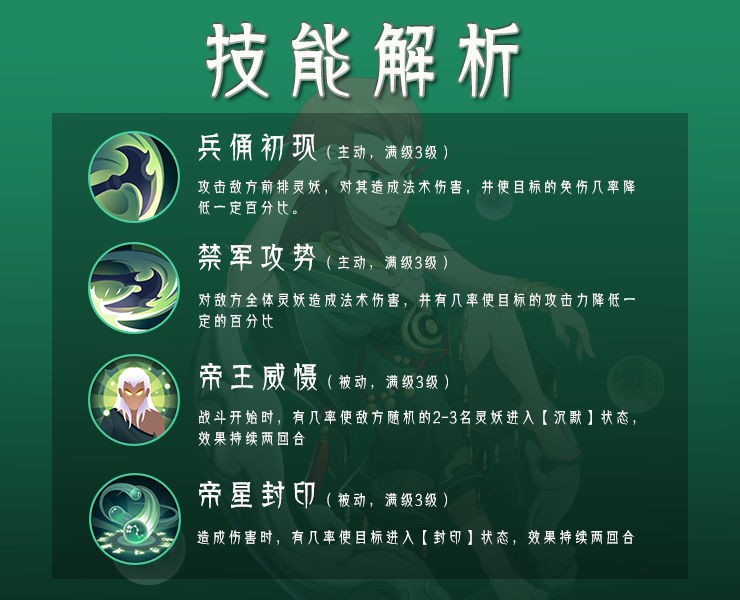 夏启的1技能【兵俑初现】可以对敌方前排3名灵妖造成法术伤害,并且使目标的免伤降低;2技能【禁军攻势】是对敌方全体灵妖造成法术攻击,并且有几率使目标的攻击力降低;被动技能【帝王威慑】则是在战斗开始时,有几率使敌方3名随机灵妖进入沉默状态;【帝星封印】则是在夏启造成伤害时,有几率使目标进入封印状态,被封印的目标无法使用被动技能。是一名及群伤、控制与一身的灵妖。
