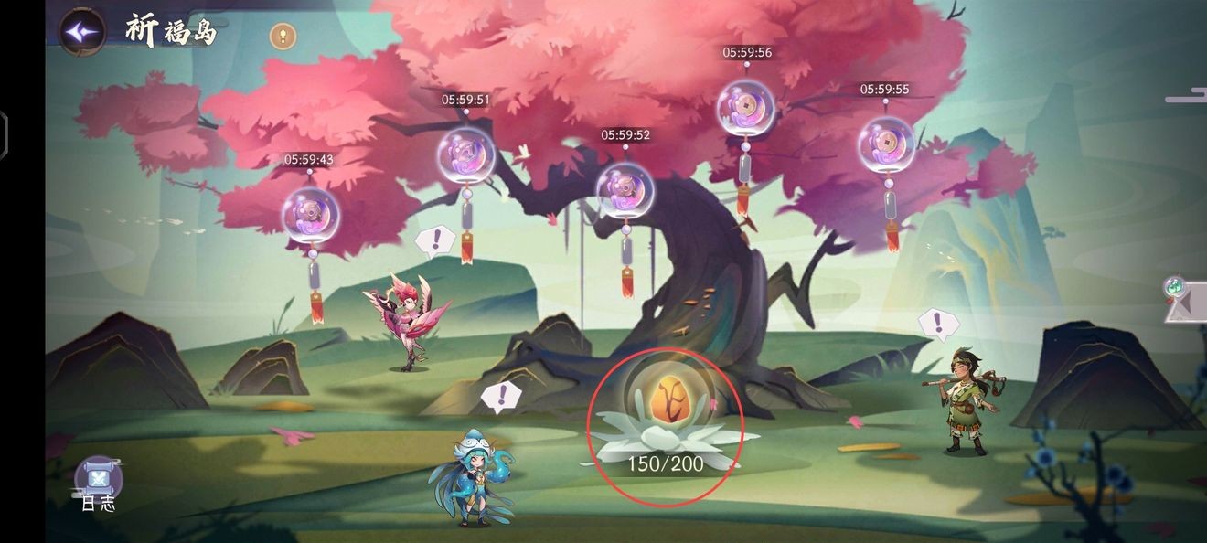 这个祈福岛的灵蛋,就是图上那个圈圈里的,建议选择凌霄或幽冥阵容的碎片,毕竟这个耗时长还是选择凌霄和幽冥性价比高。这个还可以去偷好友的碎片,有心情的肝帝可以看时间去定个闹钟然后准时上线偷碎片。